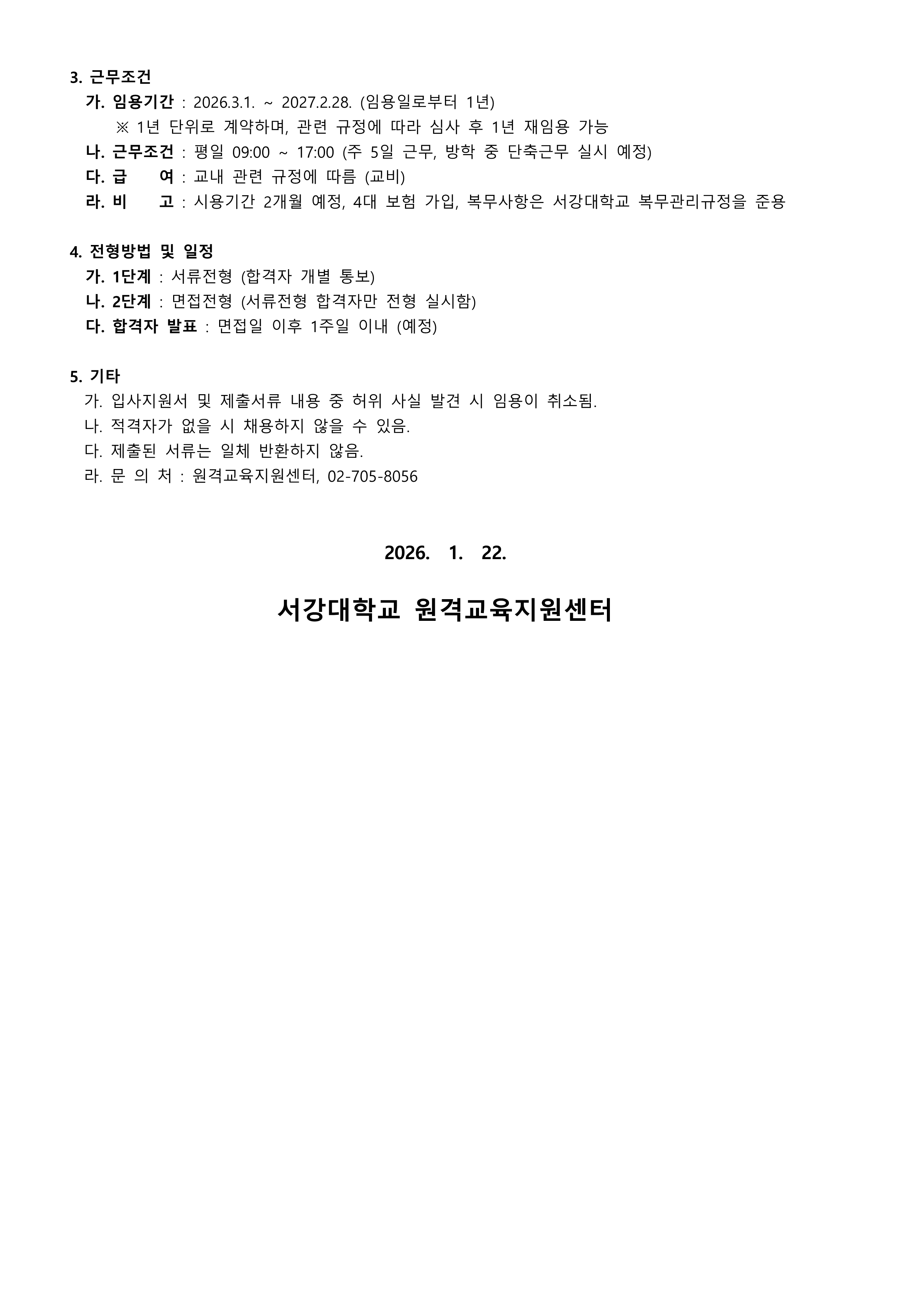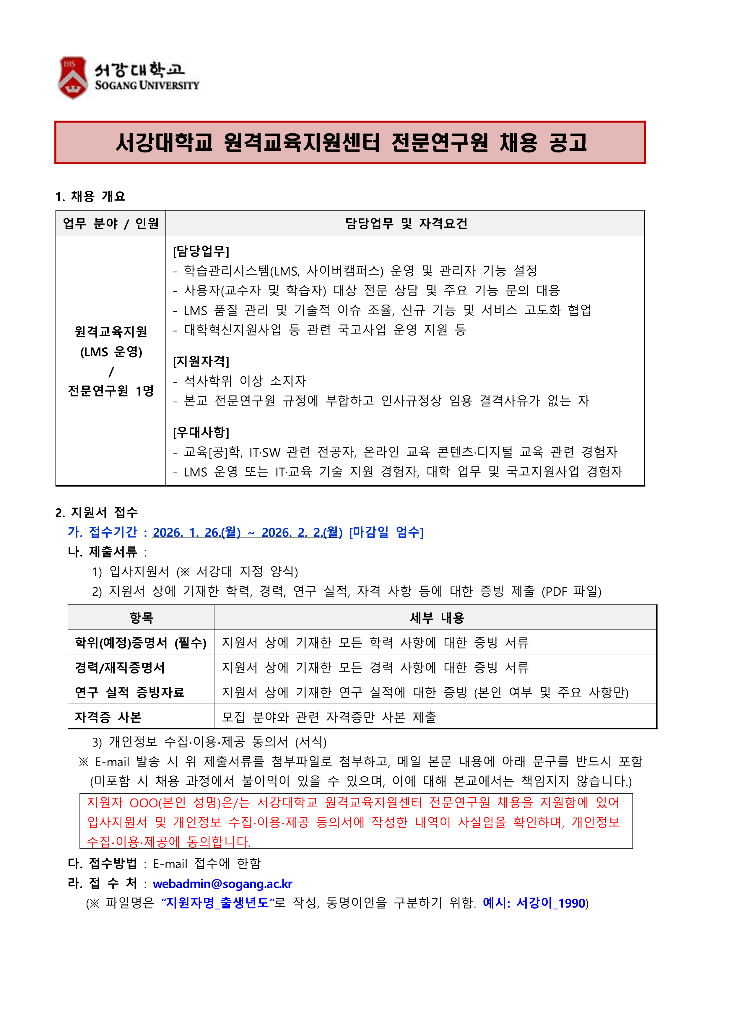 홈 sogang-general 일반공지 [원격교육지원센터] 전문연구원 채용 공고 sogang-general 일반공지 전체관리자 [원격교육지원센터] 전문연구원 채용 공고 작성자: 전체관리자 게시일: 2026. 1. 22. 오후 2:28:10 첨부파일 [서식1]원격교육지원센터_전문연구원_지원서.hwp [서식2]개인정보_수집∙이용∙제공_동의서.hwp