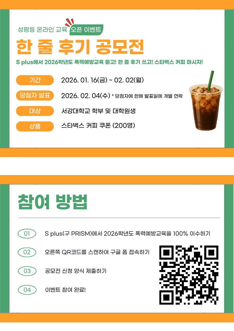 ▶교육 이수 방법 : S plus(구 PRISM) 접속 > 2026학년도 학생 대상 폭력예방교육 강의실 > 온라인강의