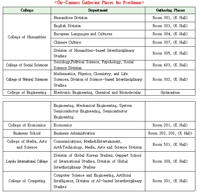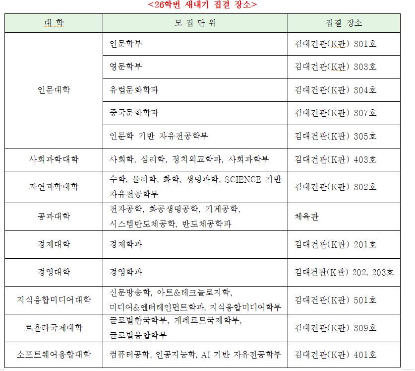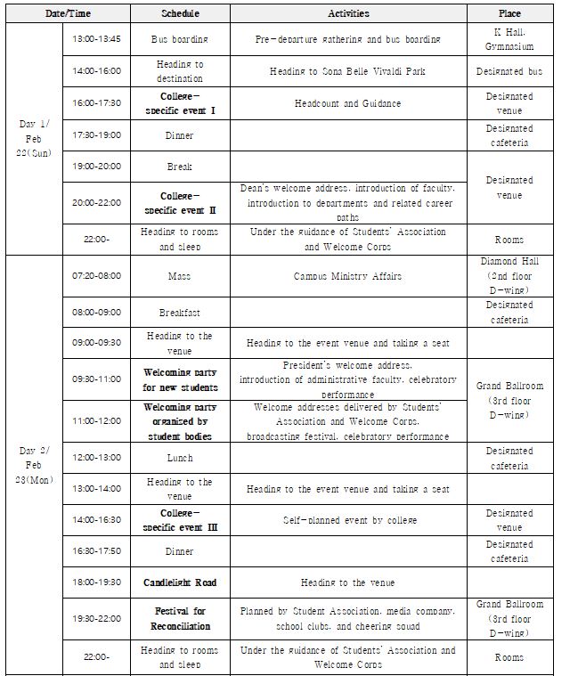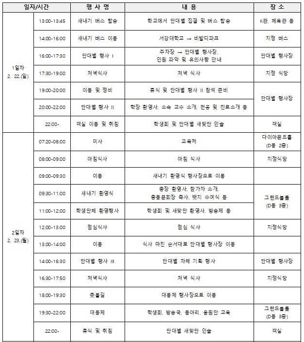 다. 주요 내용: 학교생활 소개, 학부별 교수 및 선배와의 만남, 문화 행사, 응원 교육 등