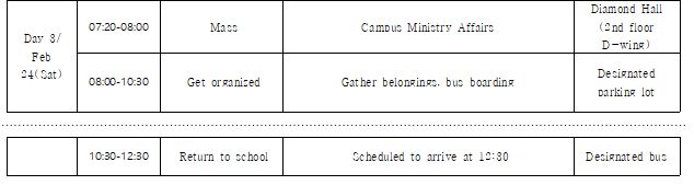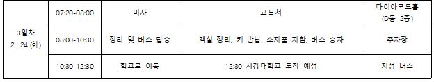 ㅇ3. 대규모 인원이 함께하는 단체행사이므로 일정 중 개인행동(스키 등)은 금지되며, 학교 및 새내기 맞이 사업단의 인솔에 따라 주시기 바랍니다. 공식 일정 외의 행동 중에 발생하는 ㅇㅇ사고에 대한 책임은 본인에게 있습니다.