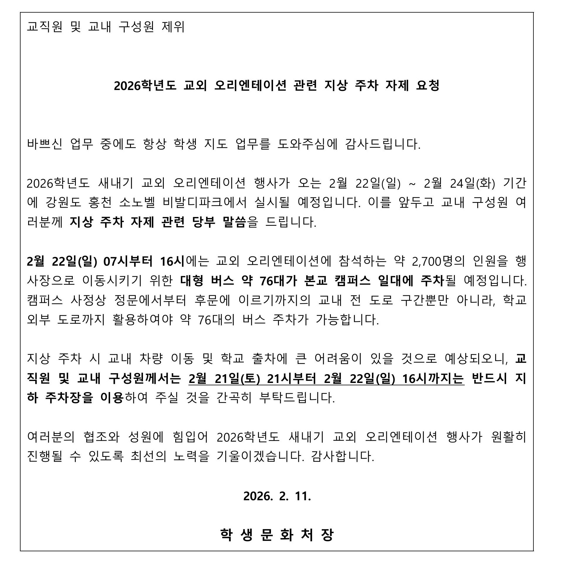 홈 sogang-general 일반공지 [학생지원팀] 2026학년도 교외 오리엔테이션 관련 지상 주차 자제 요청 (2/21~2/22) sogang-general 일반공지 발전홍보팀 [학생지원팀] 2026학년도 교외 오리엔테이션 관련 지상 주차 자제 요청 (2/21~2/22) 작성자: 발전홍보팀 게시일: 2026. 2. 11. 오전 10:51:25
