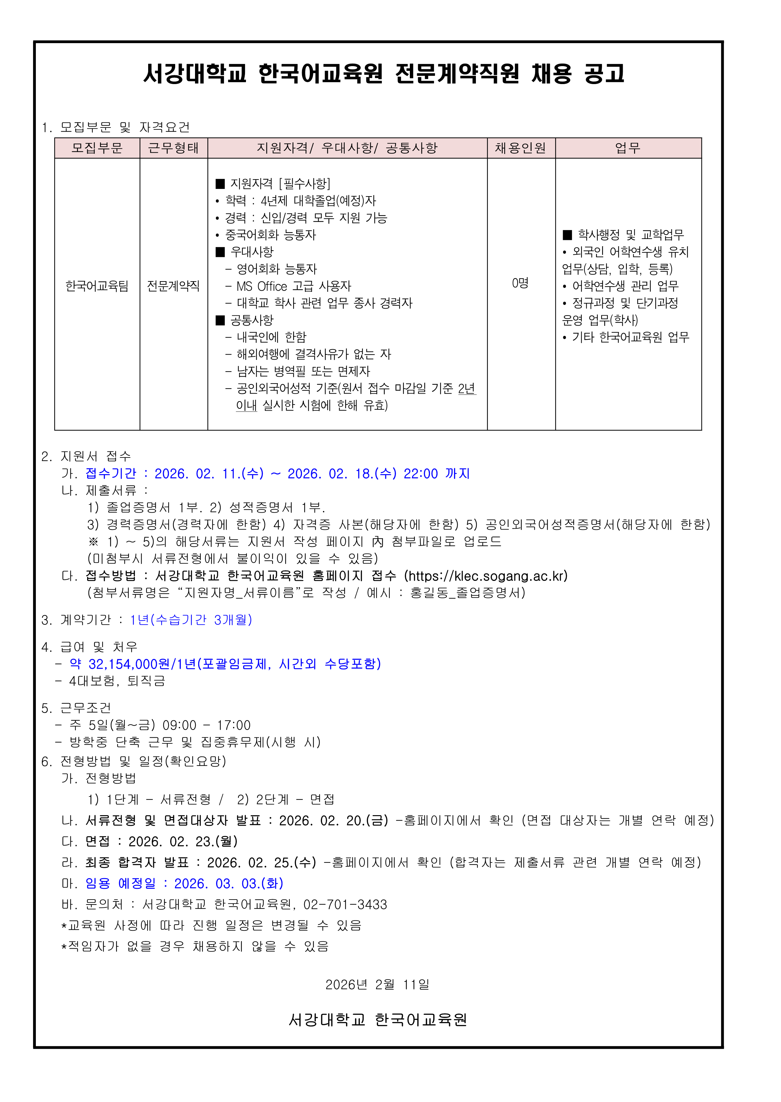 홈 sogang-general 일반공지 [서강대학교 한국어교육원] 전문계약직 채용 공고 (~2/18) sogang-general 일반공지 발전홍보팀 [서강대학교 한국어교육원] 전문계약직 채용 공고 (~2/18) 작성자: 발전홍보팀 게시일: 2026. 2. 12. 오후 2:04:32 첨부파일 한국어교육원 전문계약직 모집공고2026.02.11_최종.pdf