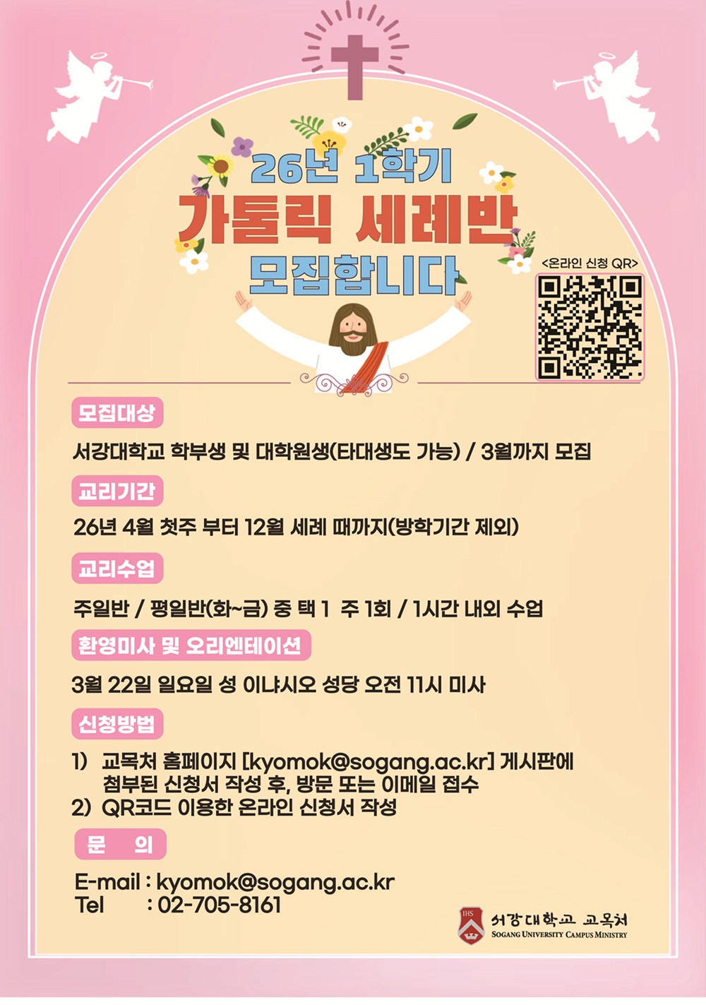 홈 sogang-general 일반공지 [교목처] 2026년 1학기 학생 세례준비반 모집(~3/31) sogang-general 일반공지 발전홍보팀 [교목처] 2026년 1학기 학생 세례준비반 모집(~3/31) 작성자: 발전홍보팀 게시일: 2026. 3. 5. 오전 9:26:03