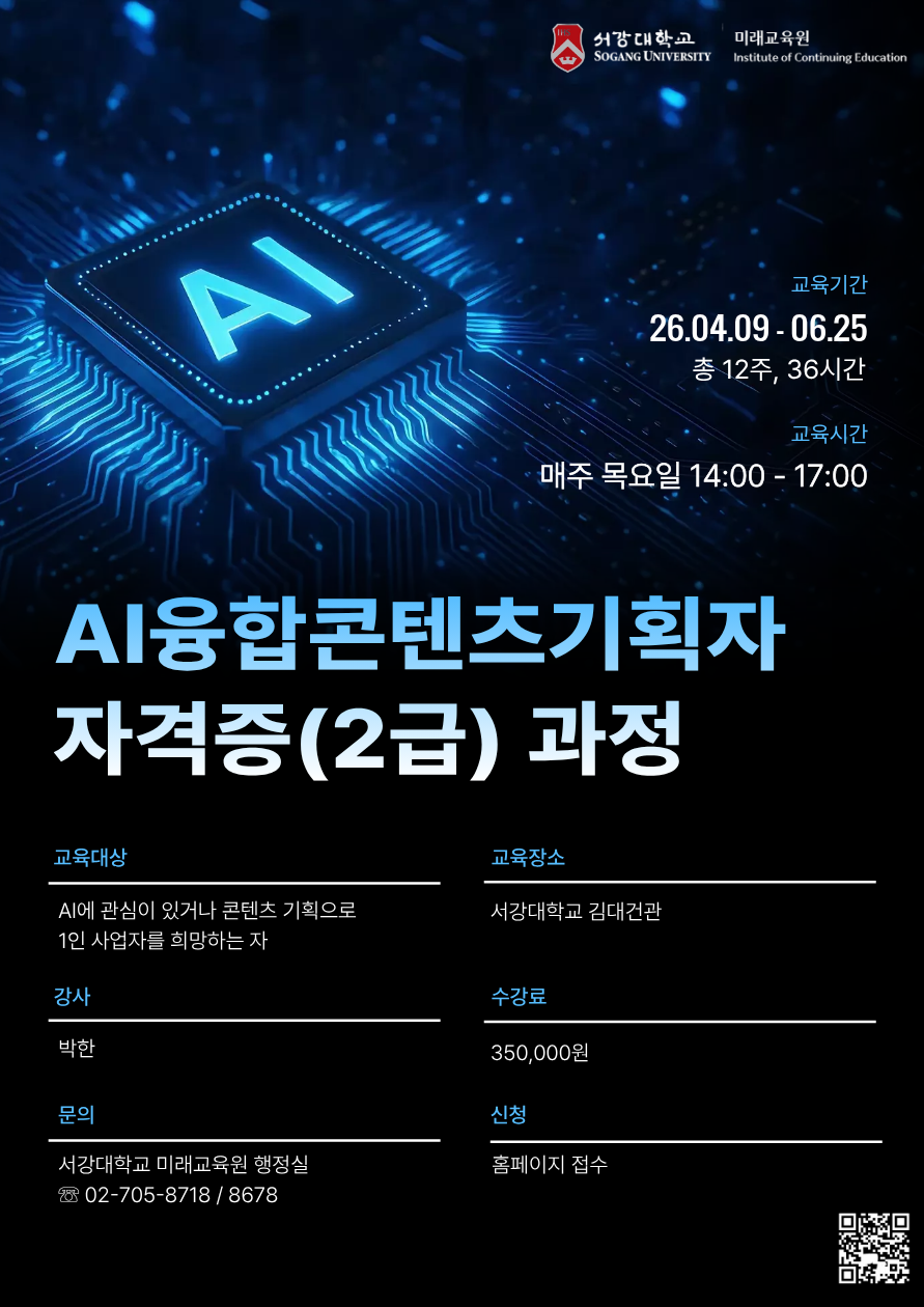 홈 sogang-general 일반공지 [미래교육원] AI융합콘텐츠기획자 자격증(2급) 과정 수강생 모집 sogang-general 일반공지 발전홍보팀 [미래교육원] AI융합콘텐츠기획자 자격증(2급) 과정 수강생 모집 작성자: 발전홍보팀 게시일: 2026. 3. 12. 오후 2:20:26 ■본교 동문(학부, 대학원 재학생 및 졸업생), 수도자는 10% 할인 ■전화 문의 : ☎02-705-8718/8678 첨부파일 강의개요 및 수업계획서.pdf