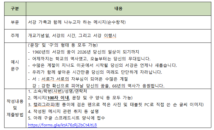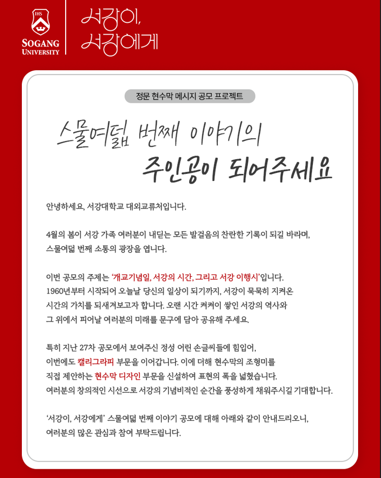 ■ 응모자격 : 서강대학교 학생(재학생, 휴학생), 동문, 교직원, 학부모 등 모든 서강 (공동체) 가족 구성원