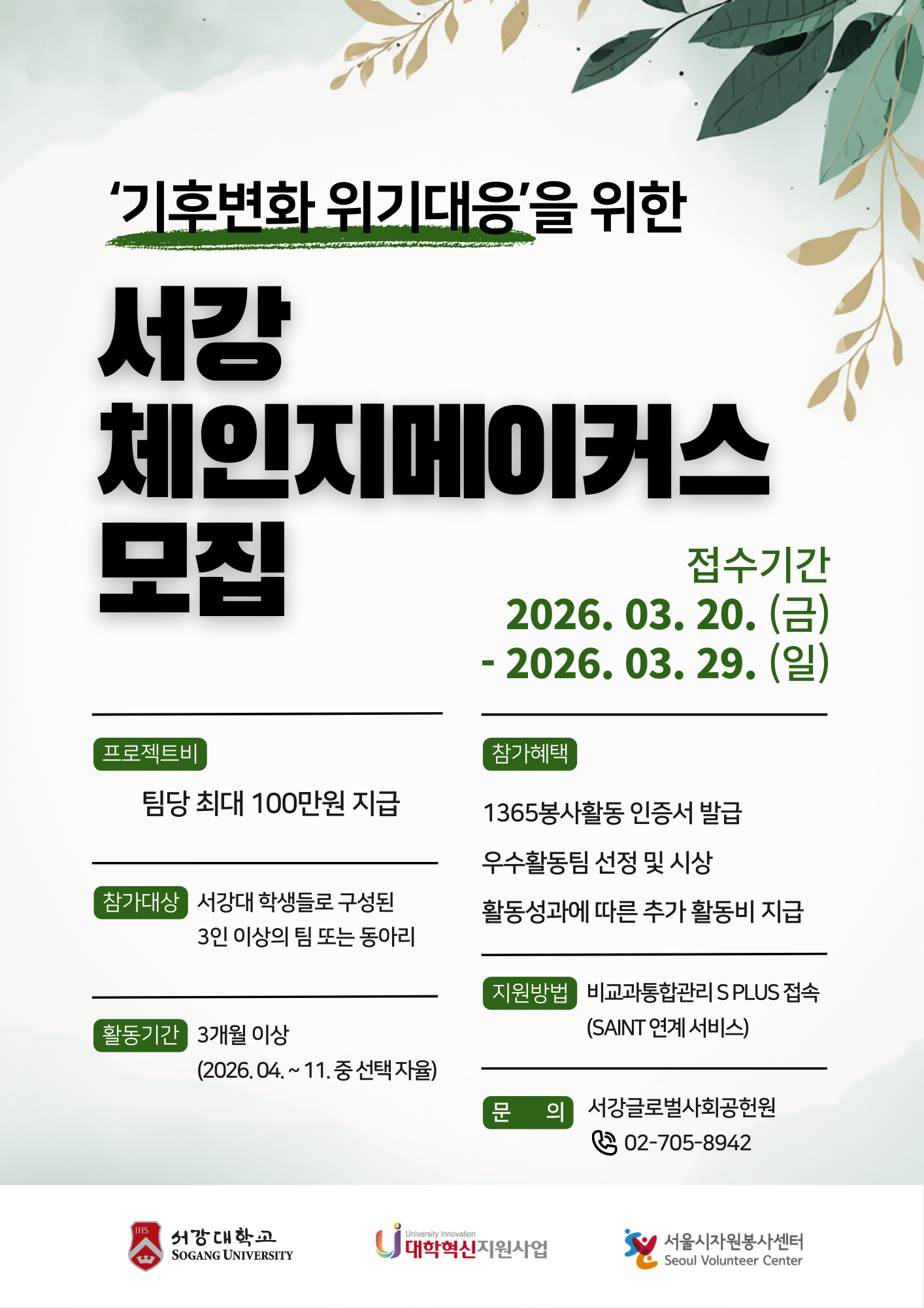 홈 sogang-general 일반공지 [서강글로벌사회공헌원] '기후변화 위기대응'을 위한 서강 체인지메이커스 모집(~3/29) sogang-general 일반공지 발전홍보팀 [서강글로벌사회공헌원] '기후변화 위기대응'을 위한 서강 체인지메이커스 모집(~3/29) 작성자: 발전홍보팀 게시일: 2026. 3. 20. 오후 2:58:42