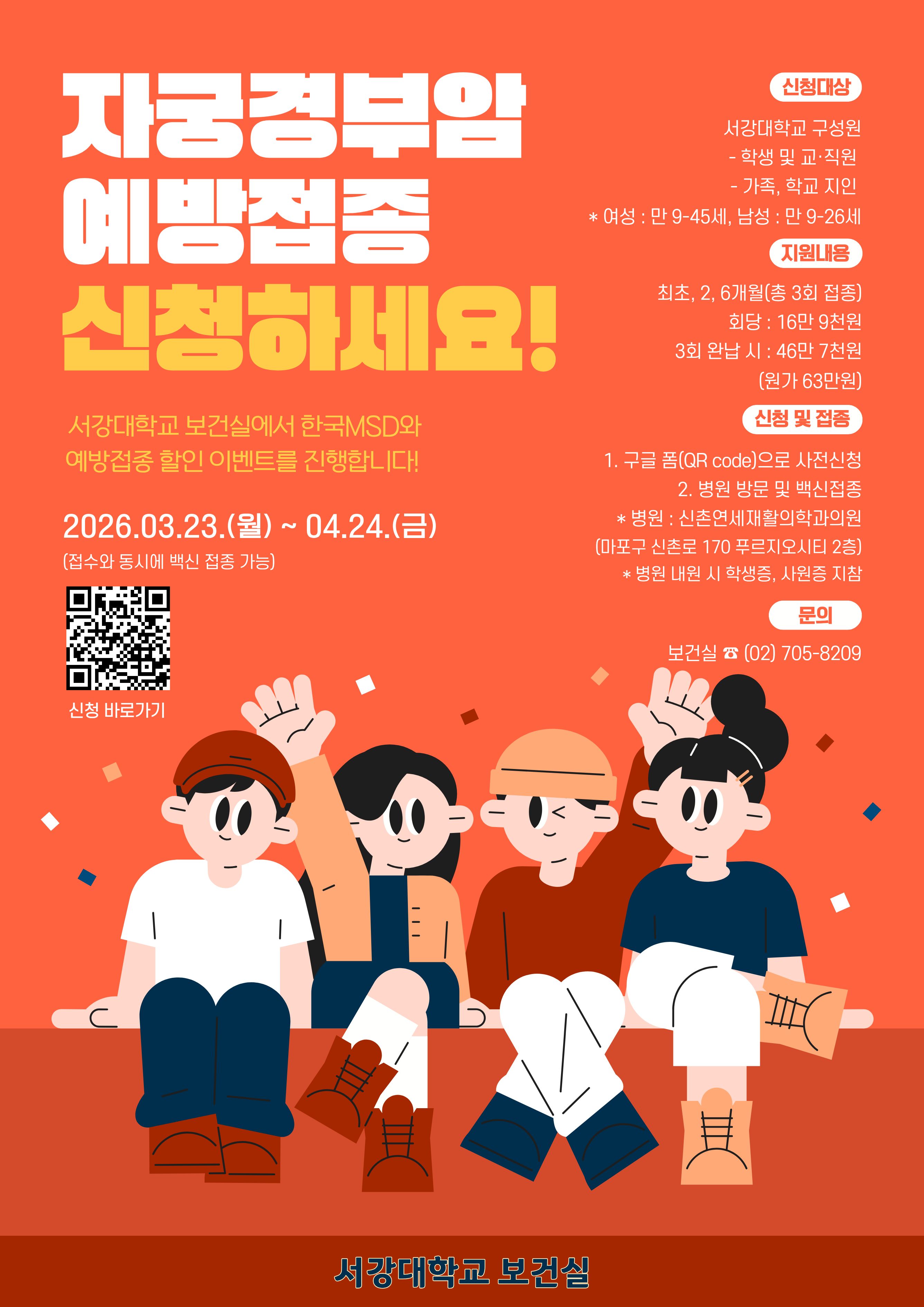 홈 sogang-general 일반공지 [보건실] 2026학년도 자궁경부암 백신(가다실 9) 접종 안내(~4/24) sogang-general 일반공지 발전홍보팀 [보건실] 2026학년도 자궁경부암 백신(가다실 9) 접종 안내(~4/24) 작성자: 발전홍보팀 게시일: 2026. 3. 20. 오후 3:02:14 첨부파일 붙임 2. 2026학년도 자궁경부암 예방접종(가다실 9) 안내문 (1).hwp