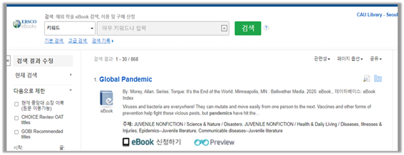 1,500여 출판사의 해외 전자책 220만여 종 검색 및 희망도서 신청 가능