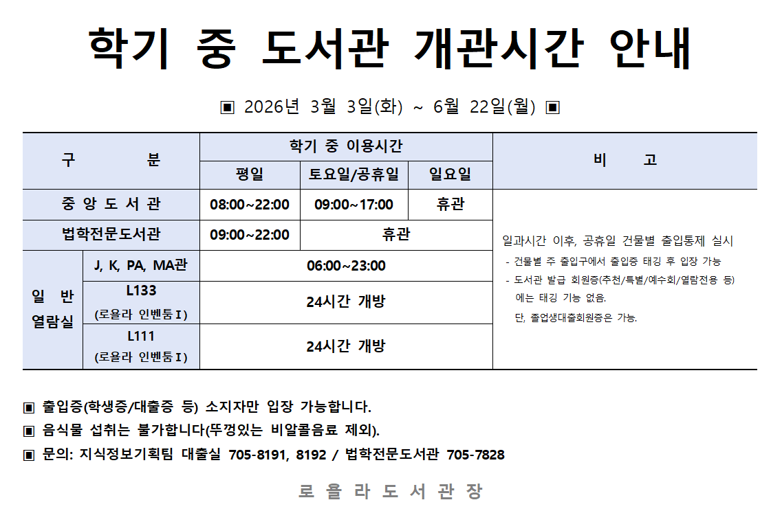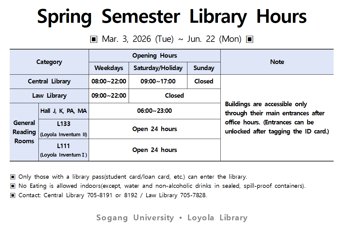 홈 sogang-loyola-notice 공지사항 2026-1학기 도서관 개관시간 • 2026 Spring SEM Library Hours sogang-loyola-notice 공지사항 2026-1학기 도서관 개관시간 • 2026 Spring SEM Library Hours 작성자: 지식정보기획팀 게시일: 2026. 2. 20. 오전 12:00:00