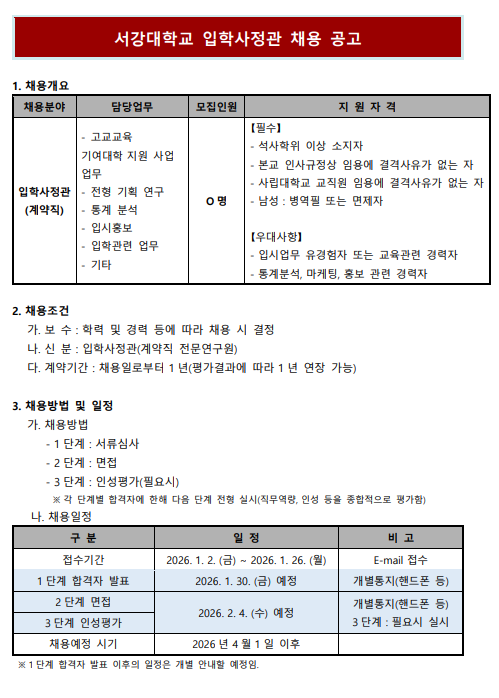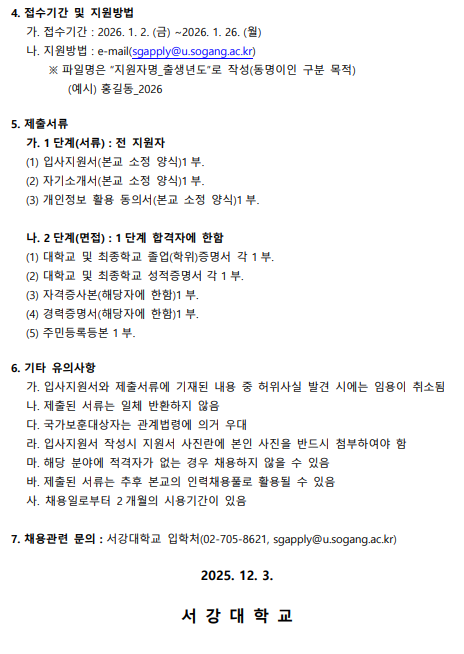 홈 sogang-sbs 공지사항 [입학팀] 서강대학교 입학사정관 채용 공고 sogang-sbs 공지사항 기타 [입학팀] 서강대학교 입학사정관 채용 공고 작성자: 경영대학 게시일: 2025. 12. 3. 오전 7:19:38 첨부파일 서강대학교 입학사정관 채용 공고_최종.pdf 붙임 제출서류 양식_입사지원서_자기소개서_동의서.hwp