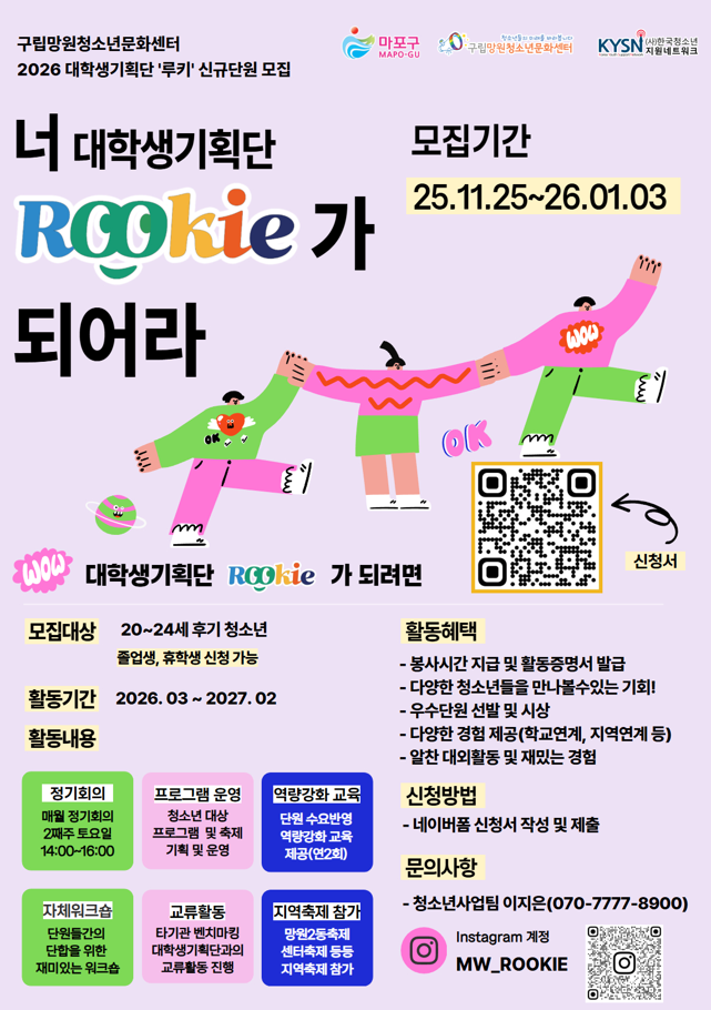 홈 sogang-scc 학생지원팀 [구립망원청소년문화센터] 2026년 대학생기획단 '루키' 신규단원 모 sogang-scc 학생지원팀 [구립망원청소년문화센터] 2026년 대학생기획단 '루키' 신규단원 모 작성자: 학생지원팀 게시일: 2025. 11. 28. 오전 12:00:00