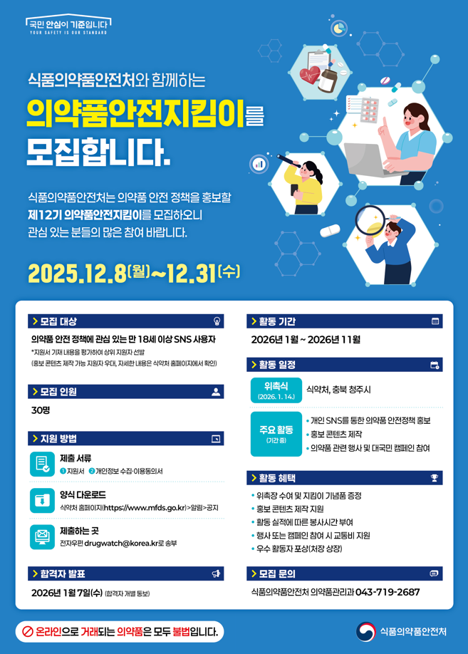 홈 sogang-scc 학생지원팀 [식품의약품안전처]제13기 의약품안전지킴이 모집 sogang-scc 학생지원팀 [식품의약품안전처]제13기 의약품안전지킴이 모집 작성자: 학생지원팀 게시일: 2025. 12. 10. 오전 12:00:00
