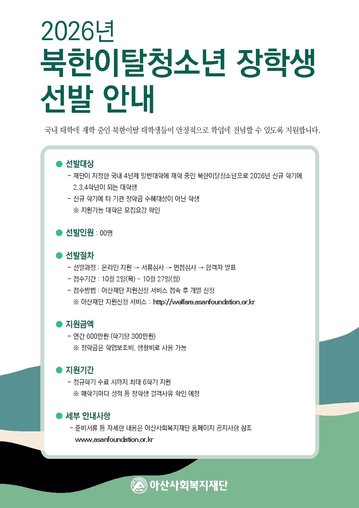 홈 sogang-scholarship 교외 [교외] 아산사회복지재단 북한이탈청소년 장학생 선발 안내(10/27 마감, 생활비 연600만원) sogang-scholarship 교외 학생지원팀 [교외] 아산사회복지재단 북한이탈청소년 장학생 선발 안내(10/27 마감, 생활비 연600만원) 작성자: 학생지원팀 게시일: 2025. 10. 15. 오전 10:33:07 첨부파일 별첨1) 2026년 북한이탈청소년 장학생 선발안내.pdf