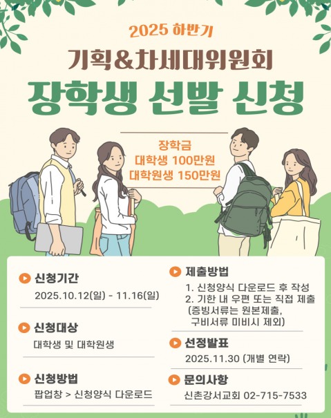 홈 sogang-scholarship 교외 [교외] 신촌강서교회 장학생 선발 안내(11/16 마감, 장학금 100만원) sogang-scholarship 교외 학생지원팀 [교외] 신촌강서교회 장학생 선발 안내(11/16 마감, 장학금 100만원) 작성자: 학생지원팀 게시일: 2025. 10. 23. 오후 3:28:53 첨부파일 장학금신청서류.zip
