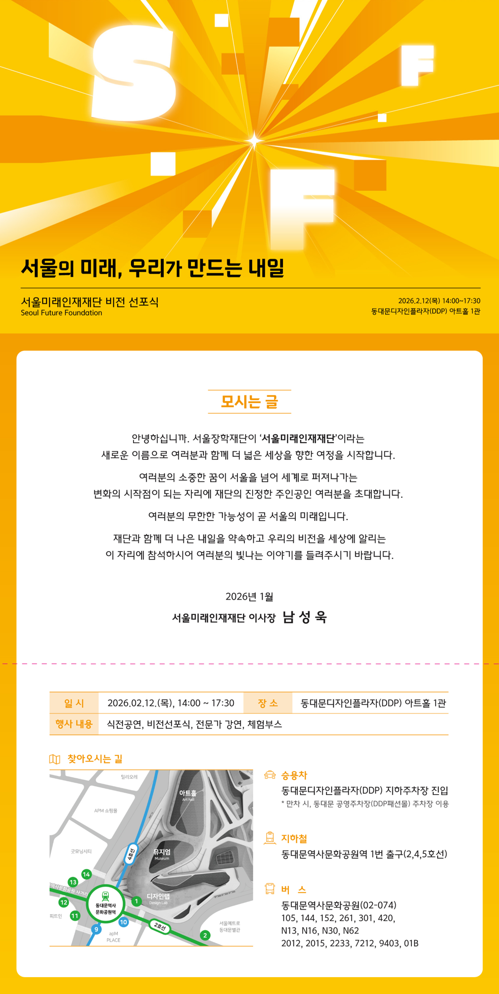 홈 sogang-scholarship 교외 [교외] 서울미래인재재단(서울장학재단) 비전선포식 개최 안내(2/12) sogang-scholarship 교외 학생지원팀 [교외] 서울미래인재재단(서울장학재단) 비전선포식 개최 안내(2/12) 작성자: 학생지원팀 게시일: 2026. 2. 5. 오후 3:07:31 참여신청 사전등록: https://forms.gle/dUgDe7hwPiy1mm9N9 ※ 본인 이외 동행자 참석 가능합니다.