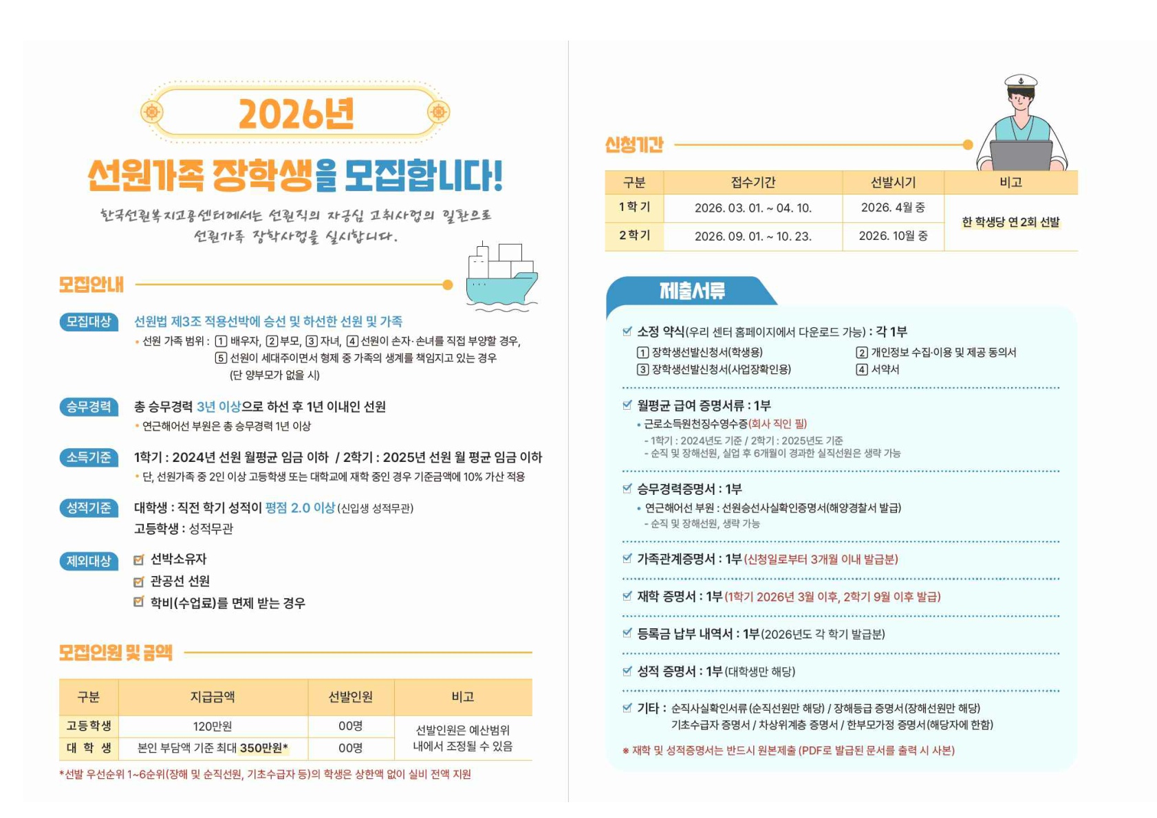 홈 sogang-scholarship 교외 [교외] 한국선원복지고용센터 선원가족 장학생 선발 안내(4/10 마감, 등록금 최대 350만원) sogang-scholarship 교외 학생지원팀 [교외] 한국선원복지고용센터 선원가족 장학생 선발 안내(4/10 마감, 등록금 최대 350만원) 작성자: 학생지원팀 게시일: 2026. 2. 26. 오후 3:01:14 첨부파일 2026년 1학기 선원가족 장학생 선발요강.pdf