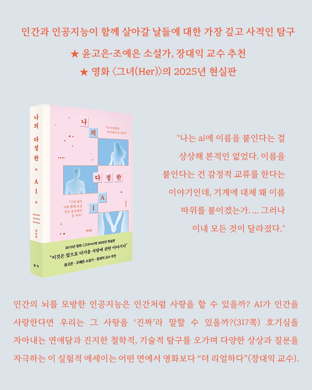 <나의 다정한 AI>는 인간과 AI의 친말힌 관계를 다룬 최초의 실험적 에세이로,