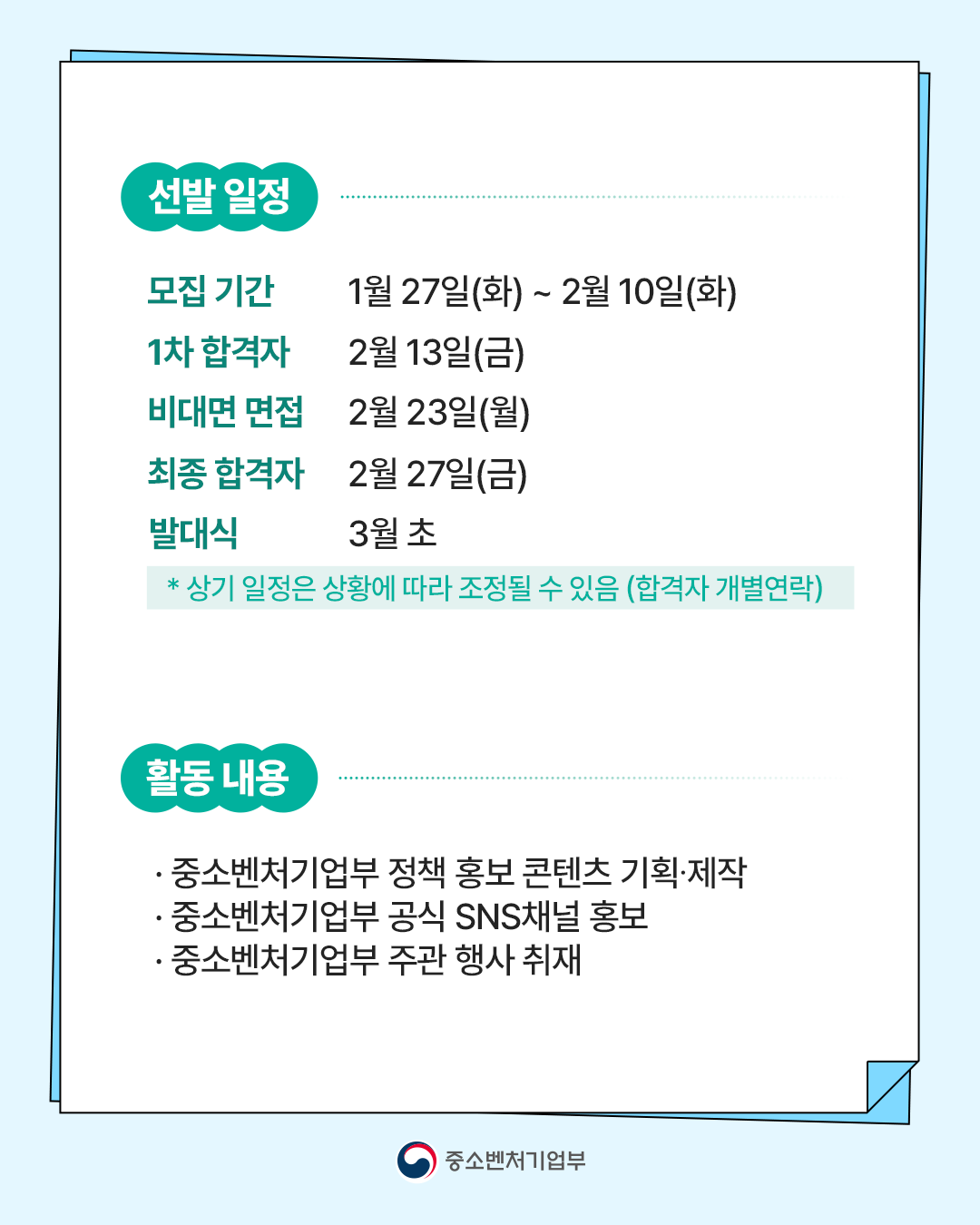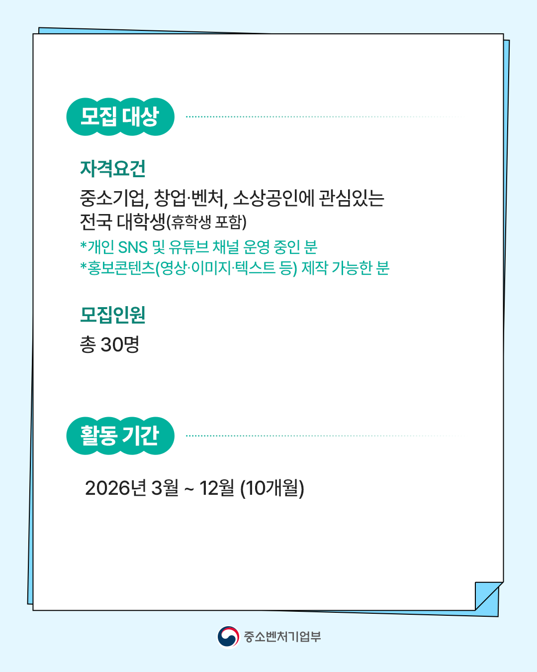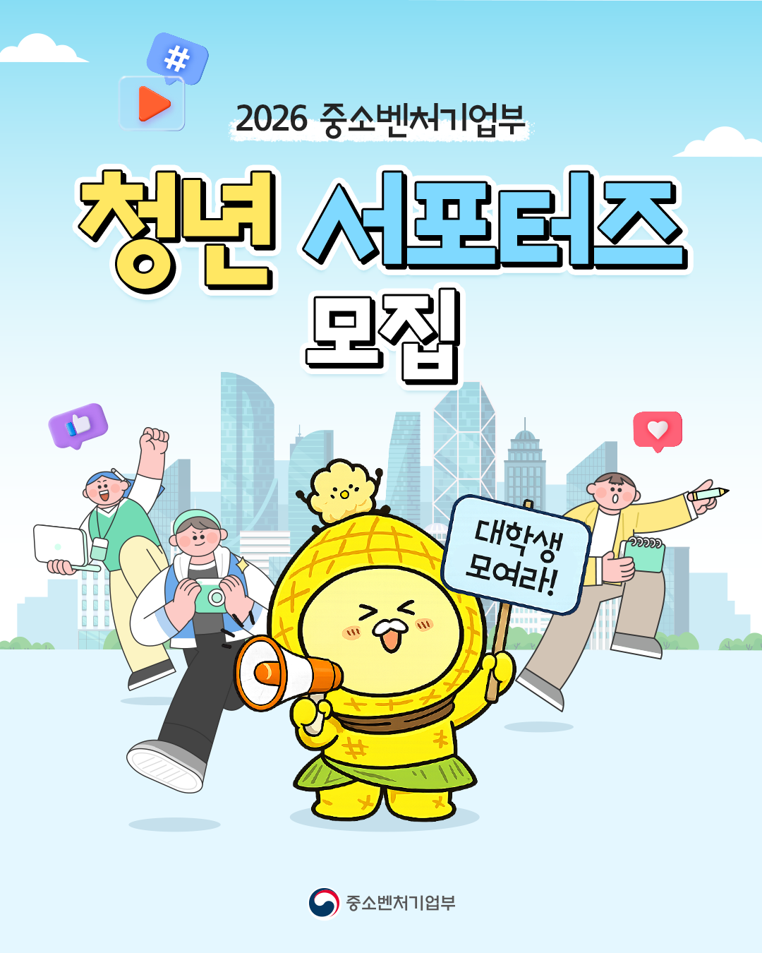 홈 sogang-smas 취업/공모전/대외활동 [중소벤처기업부] 청년 서포터즈 모집(~2/10) sogang-smas 취업/공모전/대외활동 [중소벤처기업부] 청년 서포터즈 모집(~2/10) 작성자: 신방과 게시일: 2026. 2. 2. 오전 12:00:00