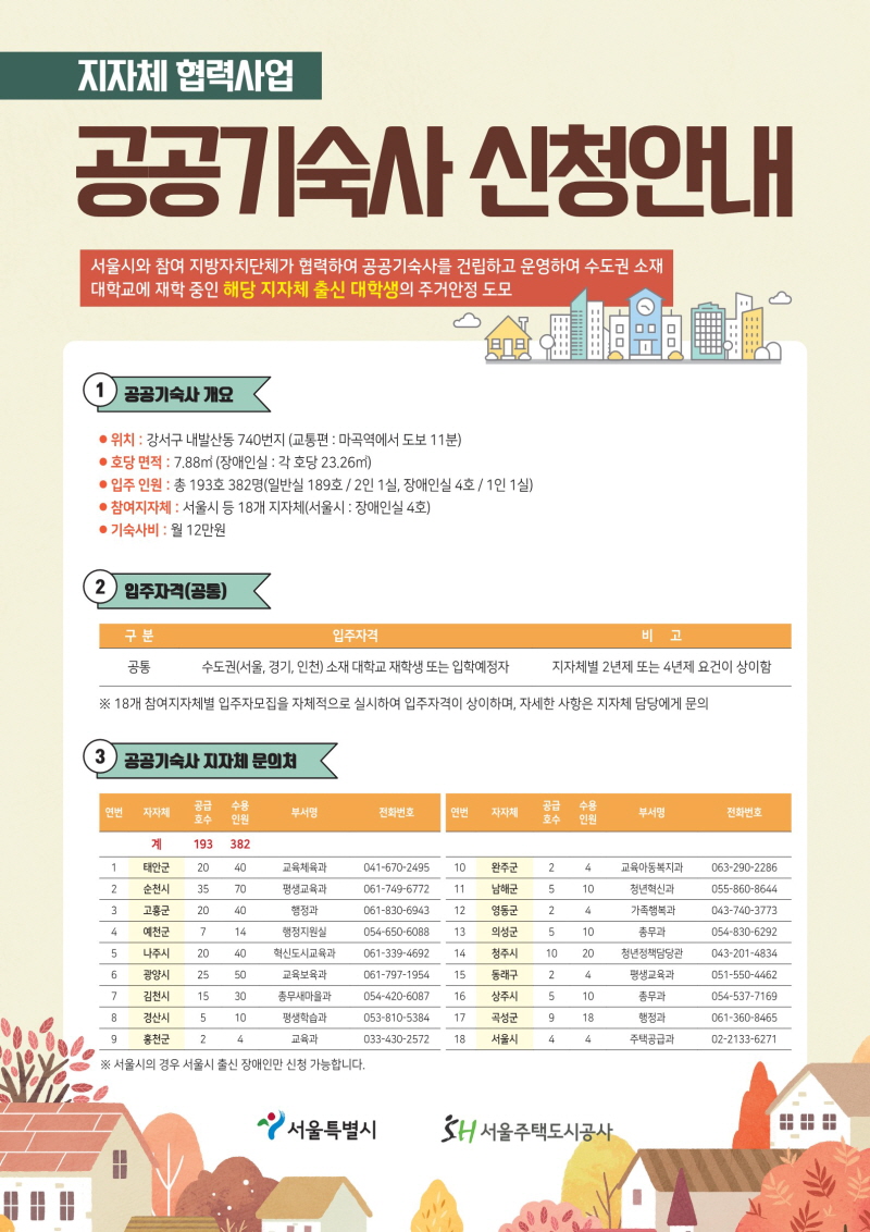 홈 sogang-student 학생공지 [서울주택도시공사] 내발산동 공공기숙사 입주 sogang-student 학생공지 학생지원팀 [서울주택도시공사] 내발산동 공공기숙사 입주 작성자: 학생지원팀 게시일: 2021. 11. 2. 오전 10:22:09