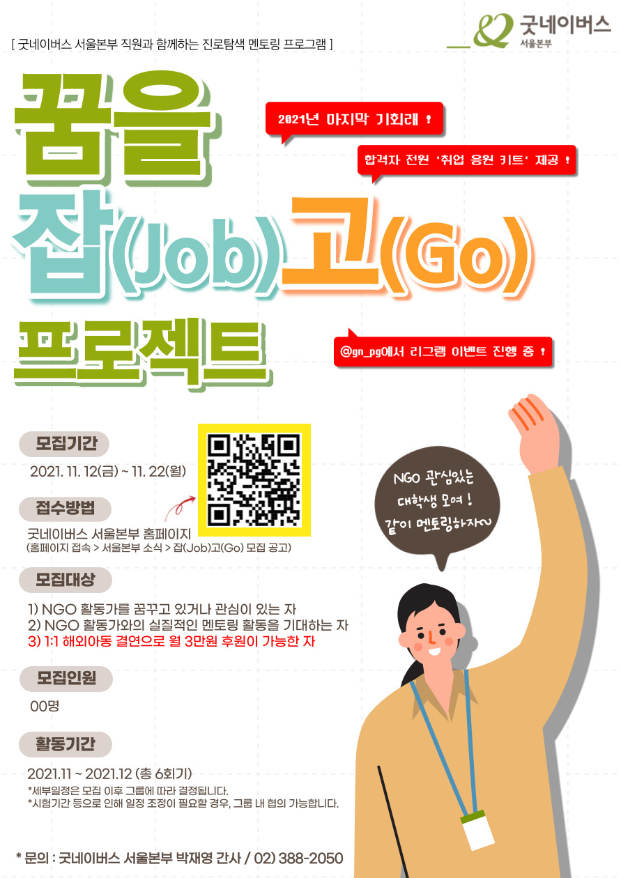 홈 sogang-student 학생공지 굿네이버스 서울본부 진로탐색 멘토링, 꿈을 잡(JOB)고(GO) 프로젝트 4기 sogang-student 학생공지 학생지원팀 굿네이버스 서울본부 진로탐색 멘토링, 꿈을 잡(JOB)고(GO) 프로젝트 4기 작성자: 학생지원팀 게시일: 2021. 11. 19. 오전 9:32:58 첨부파일 첨부_2._굿네이버스_서울본부_진로탐색_멘~.hwp 굿네이버스_서울본부_'진로탐색_멘토링,_[~.pdf