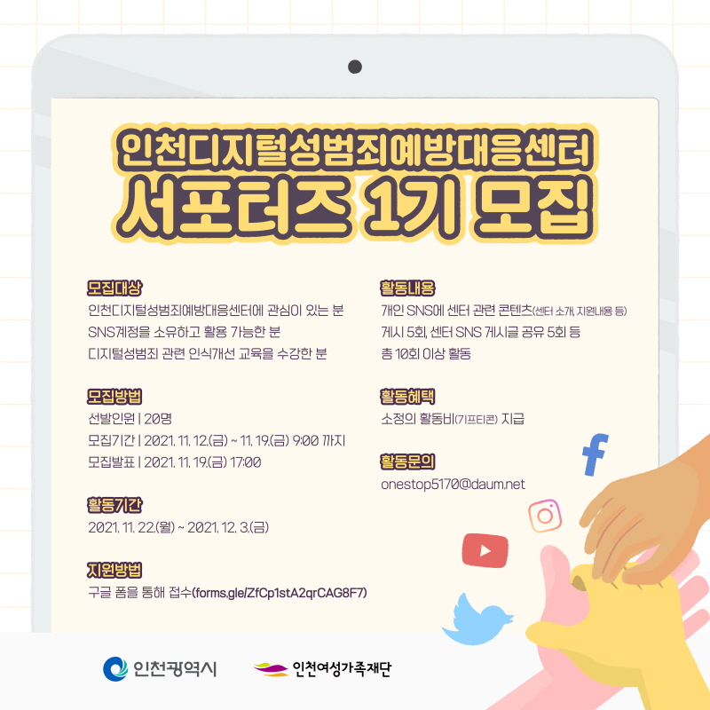 홈 sogang-student 학생공지 [인천광역시여성가족재단] 인천디지털성범죄예방대응센터 SNS 서포터즈 모집 sogang-student 학생공지 학생지원팀 [인천광역시여성가족재단] 인천디지털성범죄예방대응센터 SNS 서포터즈 모집 작성자: 학생지원팀 게시일: 2021. 11. 19. 오전 9:56:05 첨부파일 붙임3. [인천여성가족재단]인천디지털성범죄예방대응센터 피해 지원 안내문.pdf