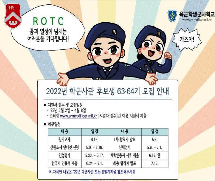 홈 sogang-student 학생공지 [육군학생군사학교] 2022년 학군사관 후보생 63,64기 모집 안내 sogang-student 학생공지 학생지원팀 [육군학생군사학교] 2022년 학군사관 후보생 63,64기 모집 안내 작성자: 학생지원팀 게시일: 2022. 2. 14. 오후 1:19:34 첨부파일 붙임__1_학군사관후보생_지원서양식최종220203.hwp 붙임__2_자기소개서양식220203.hwp 붙임_3_개인정보수집_이용_제공_동의서양식220204.hwp 붙임__4_육군_신체검사_진단서민간병원_진~.hwp 학군사관_후보생혜택.hwp