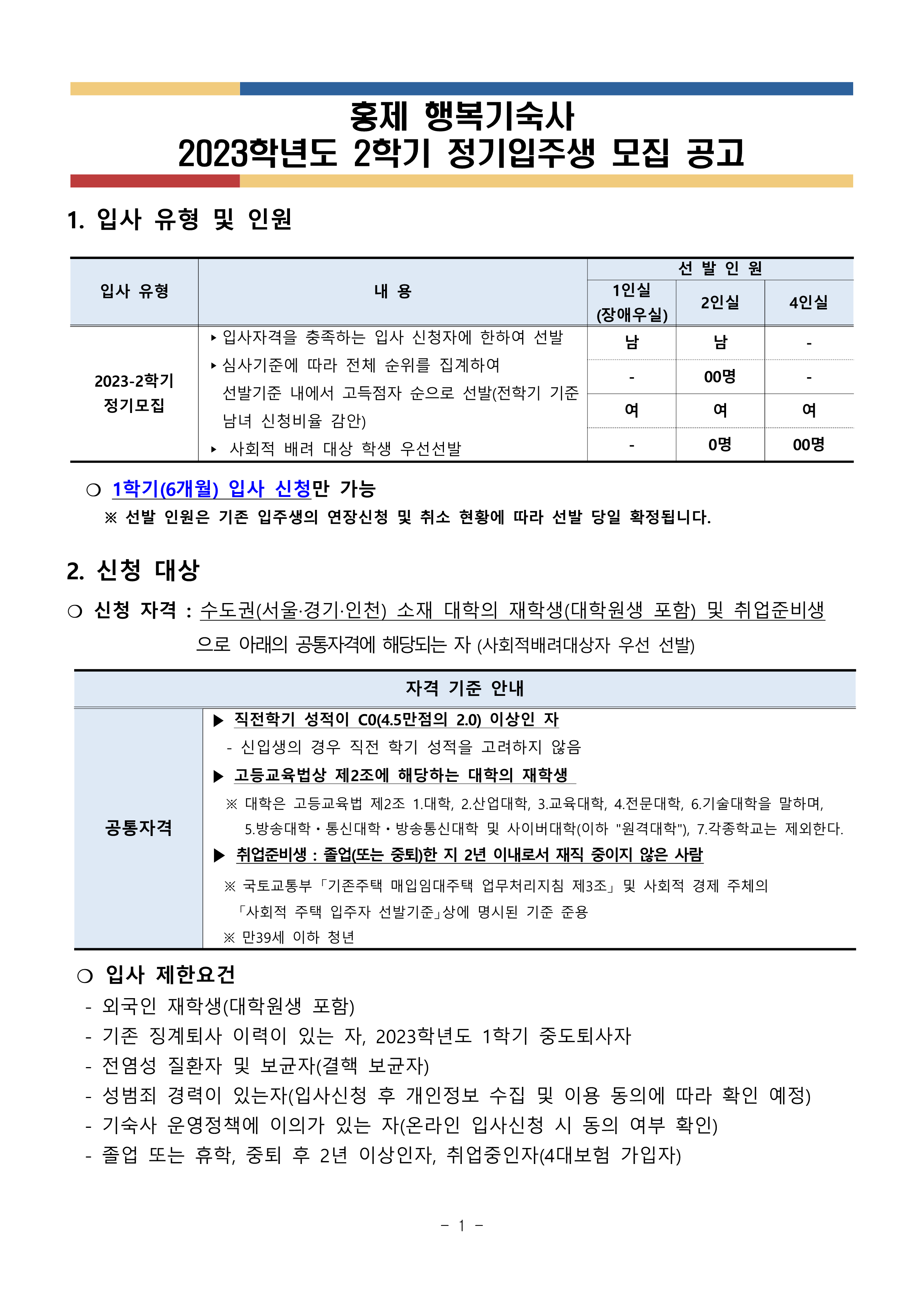 [홍제행복기숙사]2023-2 정기 입사생 모집 공고
