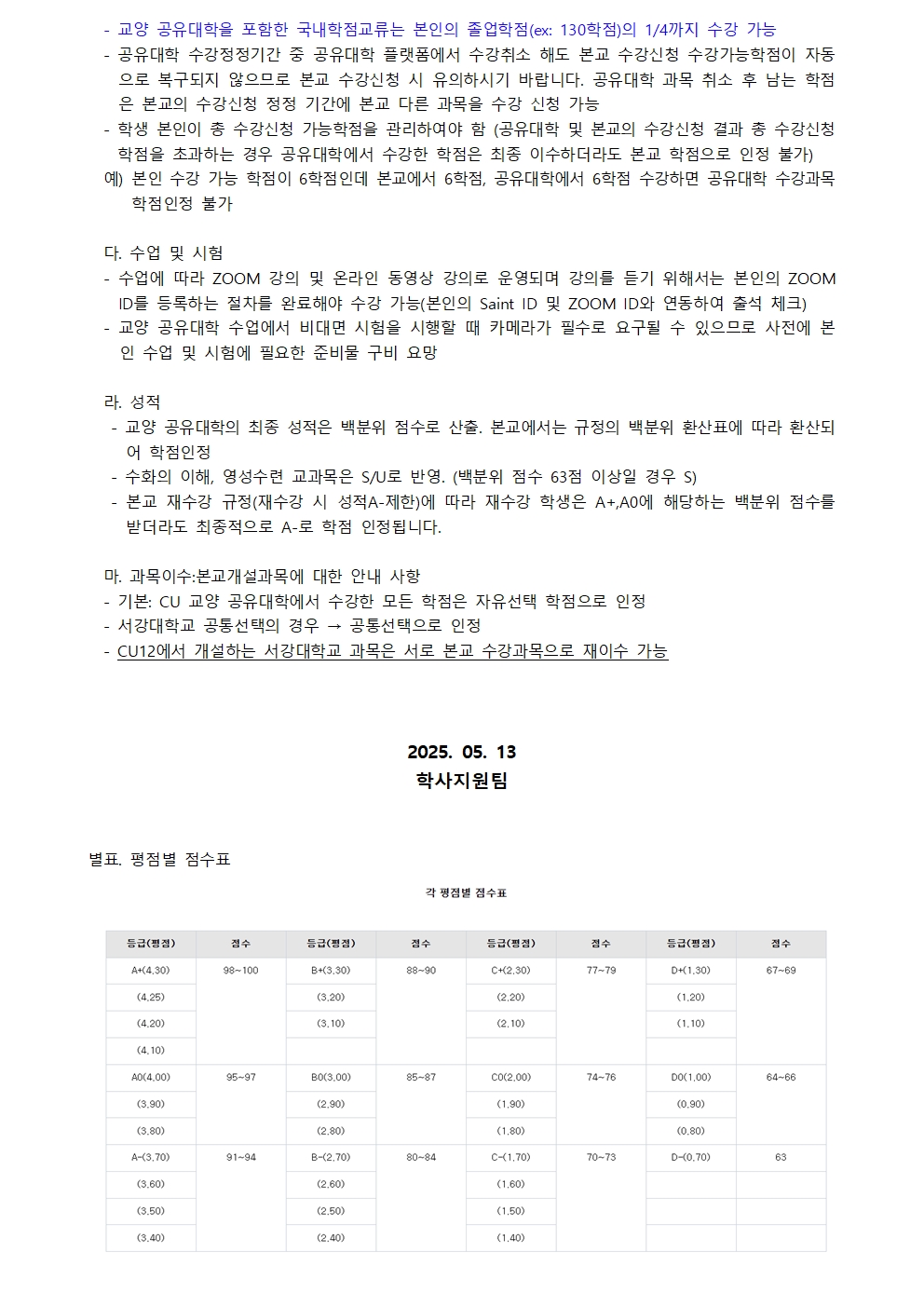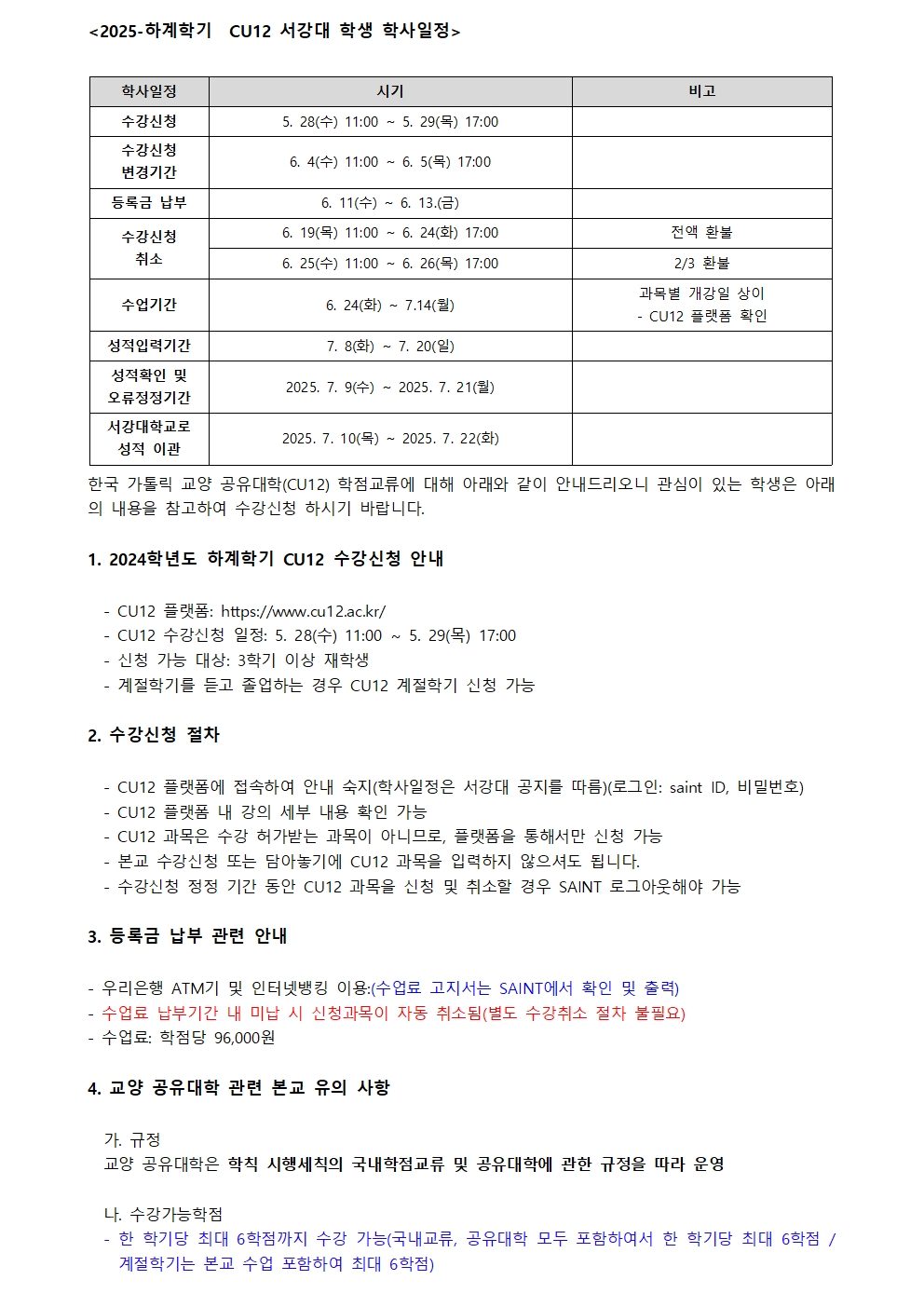 [수업,수강신청] 2025학년도 하계학기 한국 가톨릭 교양 공유대학(CU12) 서강대학교 학생 학사일정 안내