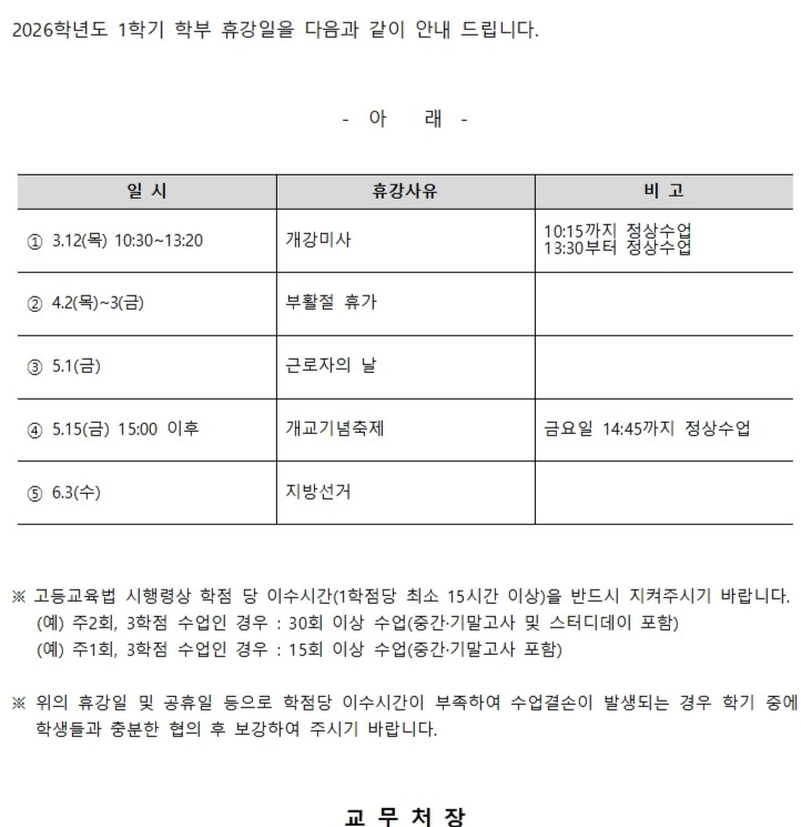 홈 sogang 수업,수강신청 [수업,수강신청] 2026학년도 1학기 학부 휴강공고 sogang 수업,수강신청 학사지원팀 [수업,수강신청] 2026학년도 1학기 학부 휴강공고 작성자: 학사지원팀 게시일: 2026. 1. 28. 오후 3:21:31