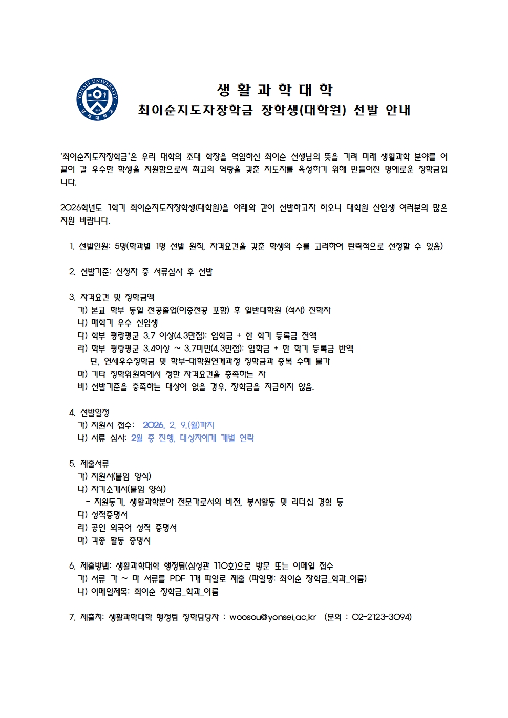홈 yonsei-che [대학원] 2026-1학기 신입생대상 최이순지도자장학금 선발 안내 2026. 2. 9.(월)까지 yonsei-che 화공생명공학과 [대학원] 2026-1학기 신입생대상 최이순지도자장학금 선발 안내 2026. 2. 9.(월)까지 작성자: 생활과학대학 게시일: 2026. 2. 2. 오전 12:00:00 첨부파일 생활과학대학_최이순지도자장학금_지원서(대학원).hwp