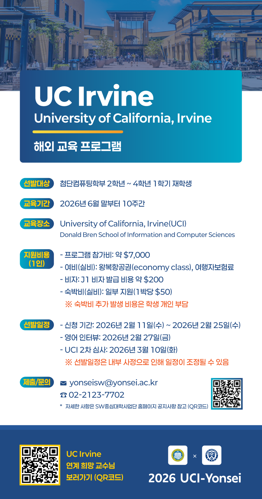 SW중심대학사업단에서 인공지능융합대학 첨단컴퓨팅학부 재학생들에게 글로벌 연구 환경에서의 실전 경험을 제공하고자 2026 YU-GAIN(Yonsei-UCI Global AI research Network) Internship Program을 시행하고자 합니다.