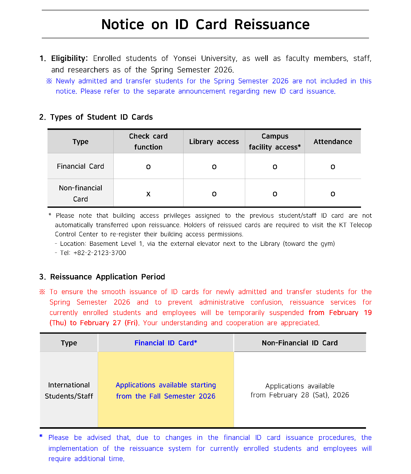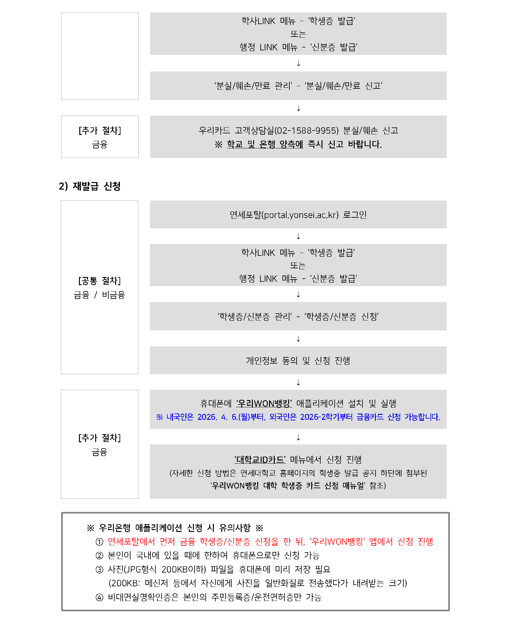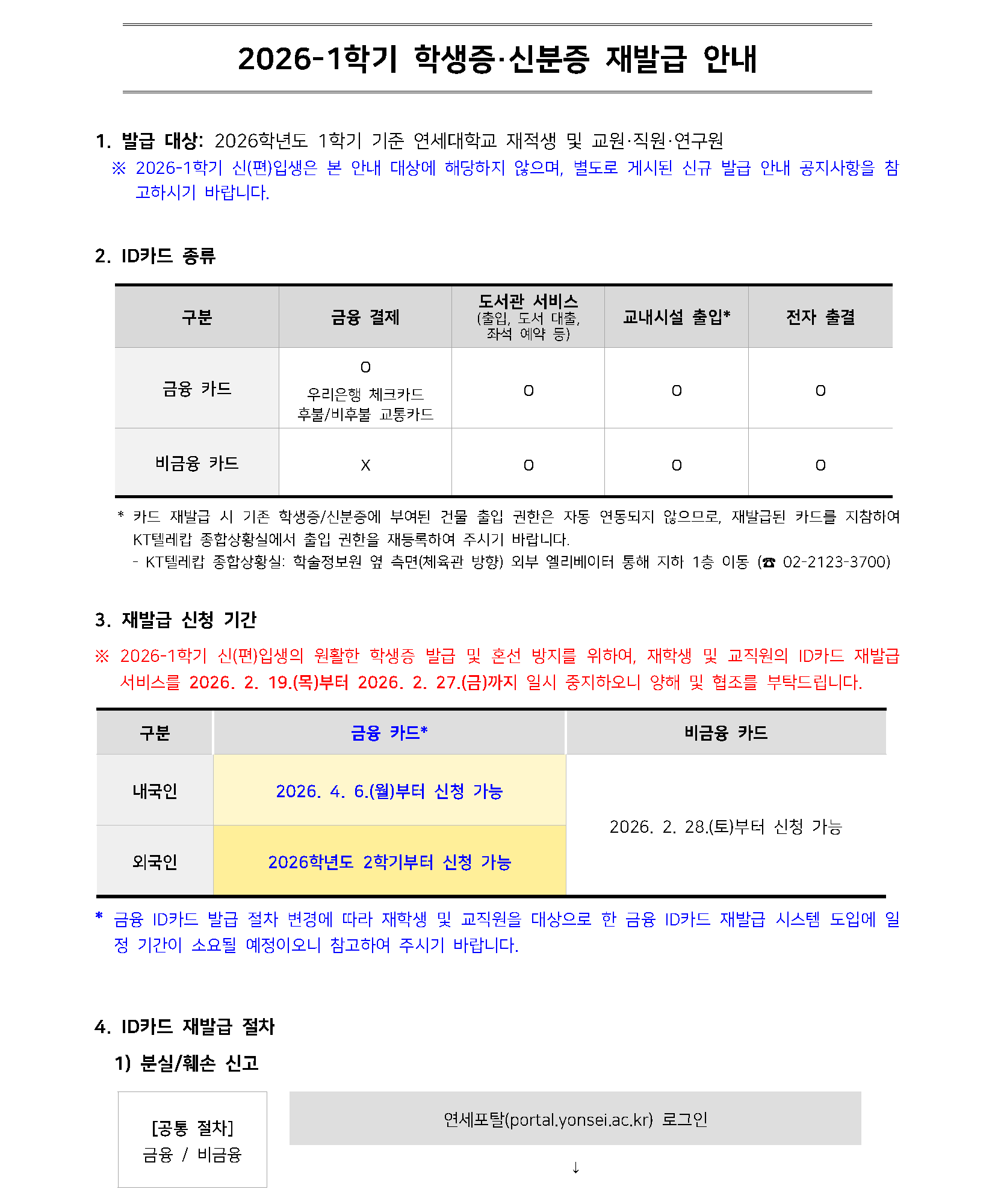 홈 yonsei-csai [공지] 2026-1학기 학생증 신분증 재발급 안내 (Notice on ID Card Reissuance) yonsei-csai 첨단컴퓨팅학부 [공지] 2026-1학기 학생증 신분증 재발급 안내 (Notice on ID Card Reissuance) 작성자: 첨부파일 게시일: 2026. 2. 26. 오전 12:00:00 첨부파일 1. 2026-1학기 학생증 신분증 재발급 안내(국문).pdf 2. 2026-1학기 학생증 신분증 재발급 안내(영문).pdf