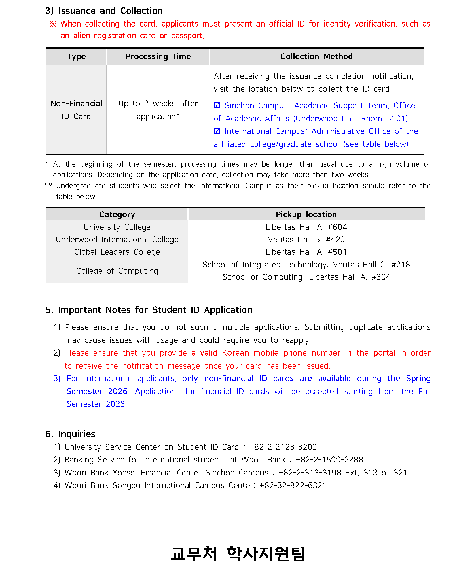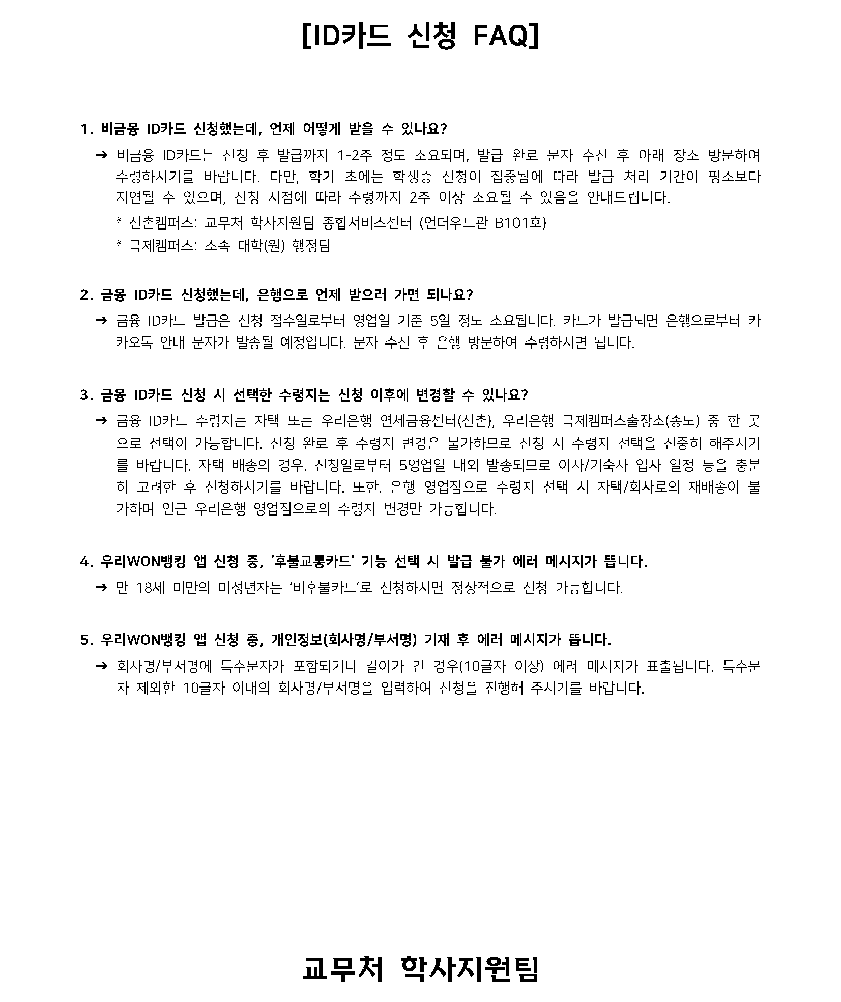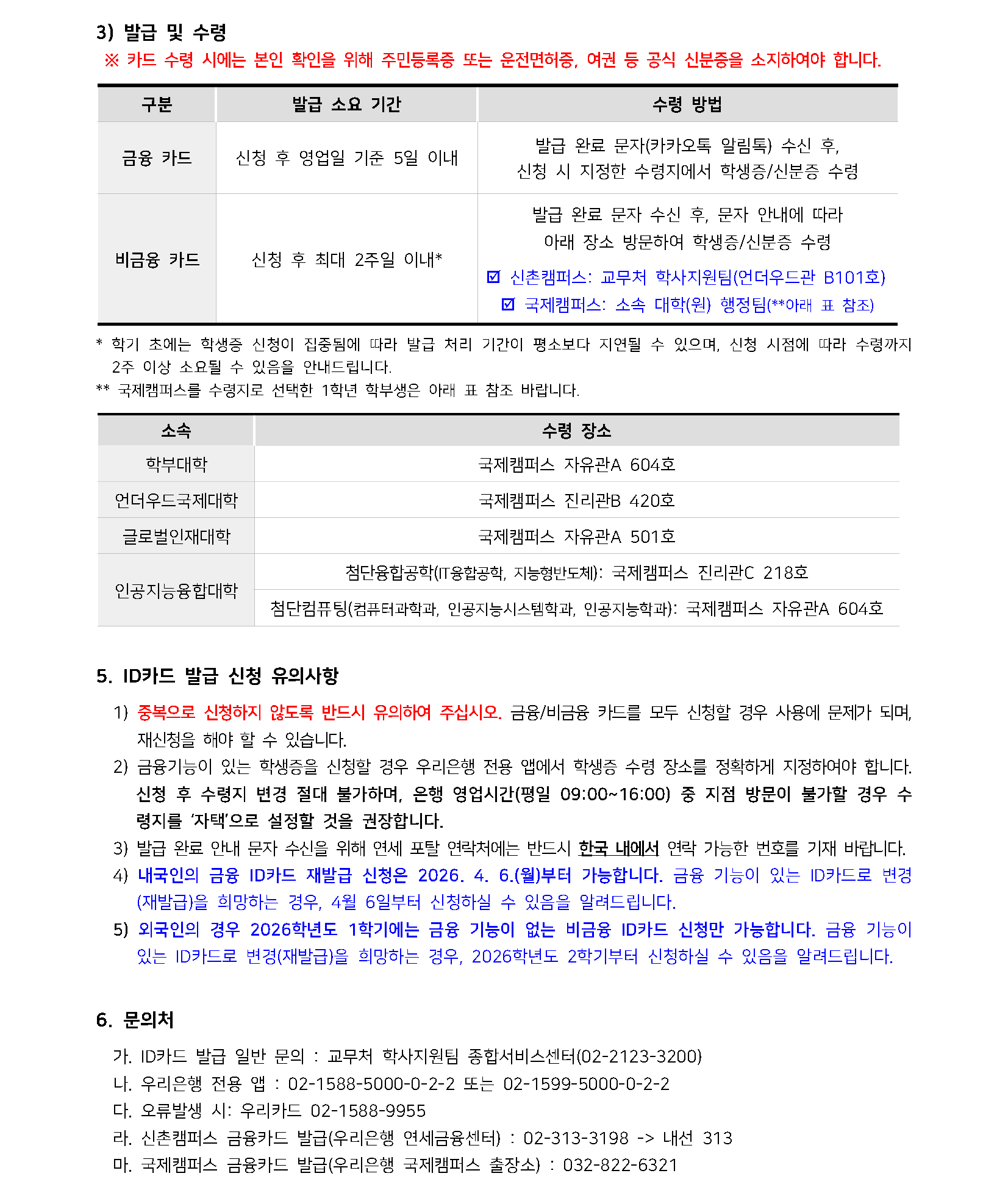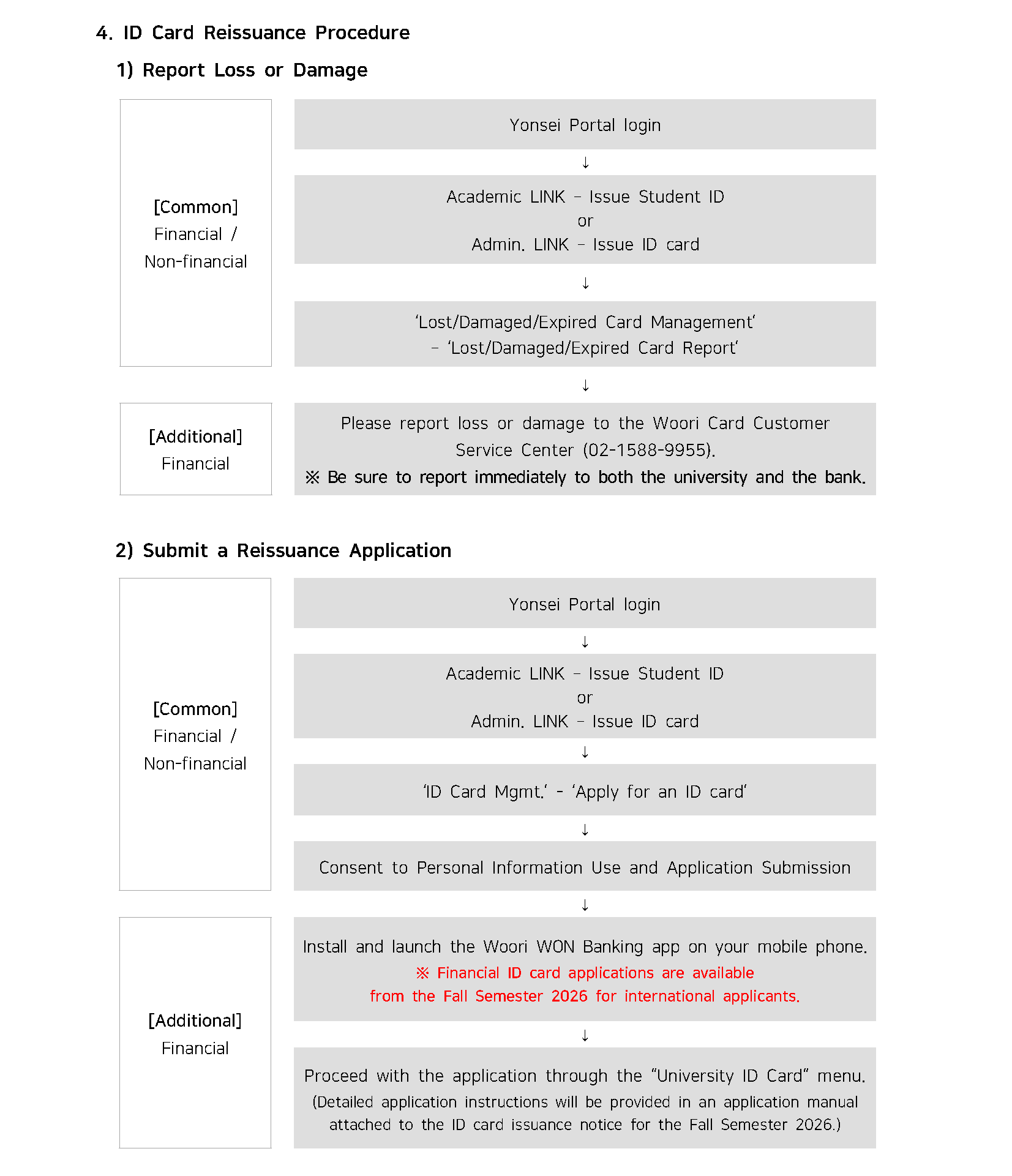 홈 yonsei-csai [공지] 2026-1학기 학생증 신분증 재발급 안내 (Notice on ID Card Reissuance) yonsei-csai 첨단컴퓨팅학부 [공지] 2026-1학기 학생증 신분증 재발급 안내 (Notice on ID Card Reissuance) 작성자: 첨부파일 게시일: 2026. 2. 26. 오전 12:00:00 첨부파일 1. 2026-1학기 학생증 신분증 재발급 안내(국문).pdf 2. 2026-1학기 학생증 신분증 재발급 안내(영문).pdf