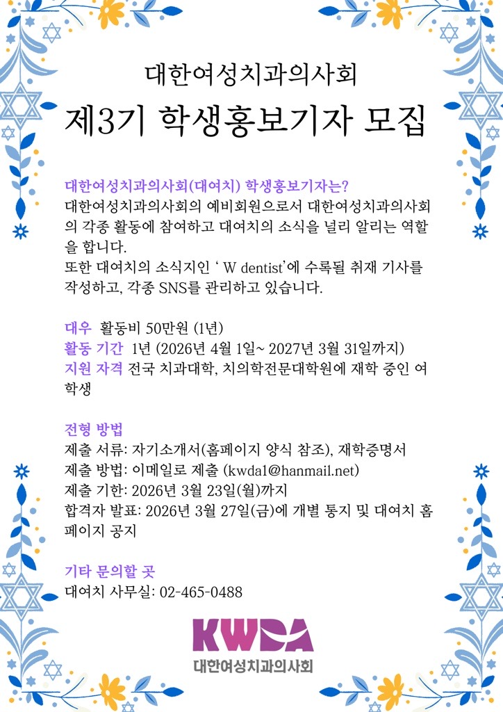 홈 yonsei-dentistry 대한여성치과의사회 제3기 학생홍보기자 모집 yonsei-dentistry 치과대학 대한여성치과의사회 제3기 학생홍보기자 모집 작성자: 치과대학 게시일: 2026. 2. 19. 오전 12:00:00