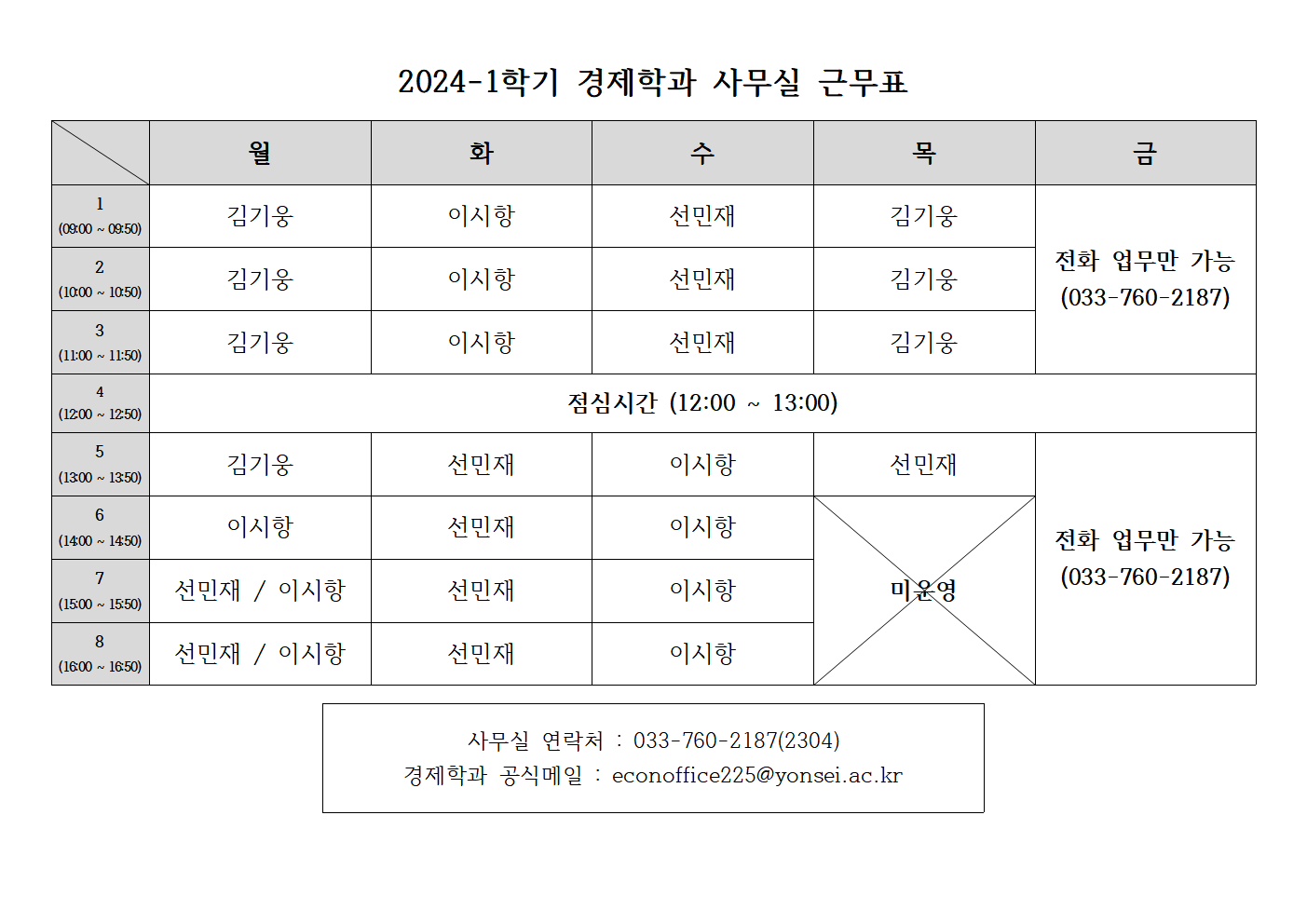 홈 yonsei-econ 24-1 경제학과 사무실 근무표 yonsei-econ 경제학부 24-1 경제학과 사무실 근무표 작성자: 경제학과 게시일: 2024. 3. 20. 오전 12:00:00 문의사항 발생 시 경제학과 사무실 근무 시간에 맞추어 문의 부탁드립니다.