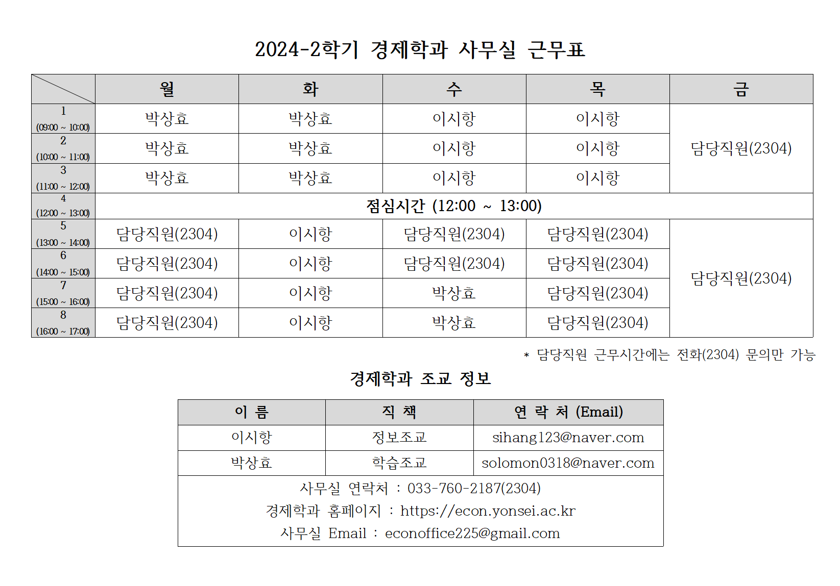 홈 yonsei-econ 24-2 경제학과 사무실 근무표 yonsei-econ 경제학부 24-2 경제학과 사무실 근무표 작성자: 경제학과 게시일: 2024. 9. 3. 오전 12:00:00 24-2 경제학과 사무실 근무표를 참고하시어, 근무시간에 맞추어 문의 부탁 드립니다.