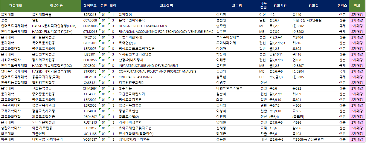 홈 yonsei-main 일반 2026학년도 1학기 학부 수강인원 미달 폐강 교과목 안내 (최종) yonsei-main 일반 교무처 학사지원팀 2026학년도 1학기 학부 수강인원 미달 폐강 교과목 안내 (최종) 작성자: 교무처 학사지원팀 게시일: 2026. 3. 6. 오후 12:10:01 2026학년도 1학기 개설과목 중 다음 과목은 수강신청인원 미달로 폐강되었음을 알려드리오니, 남은 수강변경기간 (~3.9.월. 17:00)을 이용하여 변경하시기 바랍니다.