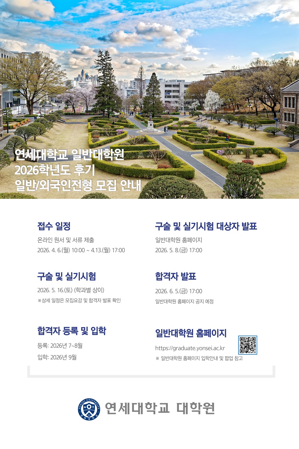 홈 yonsei-main 일반 2026학년도 후기 일반대학원 일반/외국인/편입학전형 모집 안내 yonsei-main 일반 대학원 교육지원센터 교학팀 2026학년도 후기 일반대학원 일반/외국인/편입학전형 모집 안내 작성자: 대학원 교육지원센터 교학팀 게시일: 2026. 3. 10. 오후 7:12:36 자세한 사항은, 일반대학원 홈페이지 모집요강을 참고하시기 바랍니다. (이미지 클릭시 일반대학원 홈페이지로 이동합니다.)