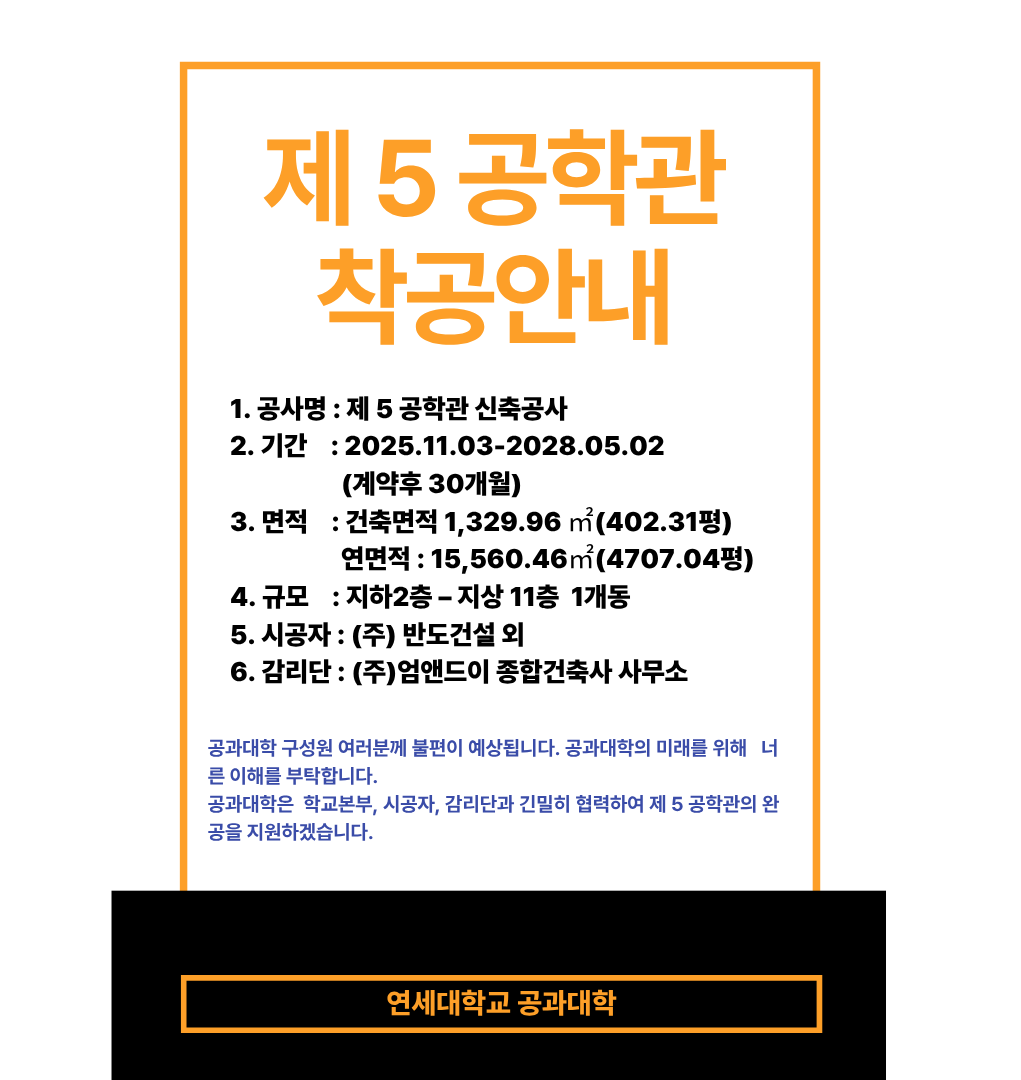 홈 yonsei-me 제5공학관 착공 안내 yonsei-me 기계공학부 제5공학관 착공 안내 작성자: 기계공학부 게시일: 2025. 12. 26. 오전 12:00:00 첨부파일 제5공학관 착공안내.png