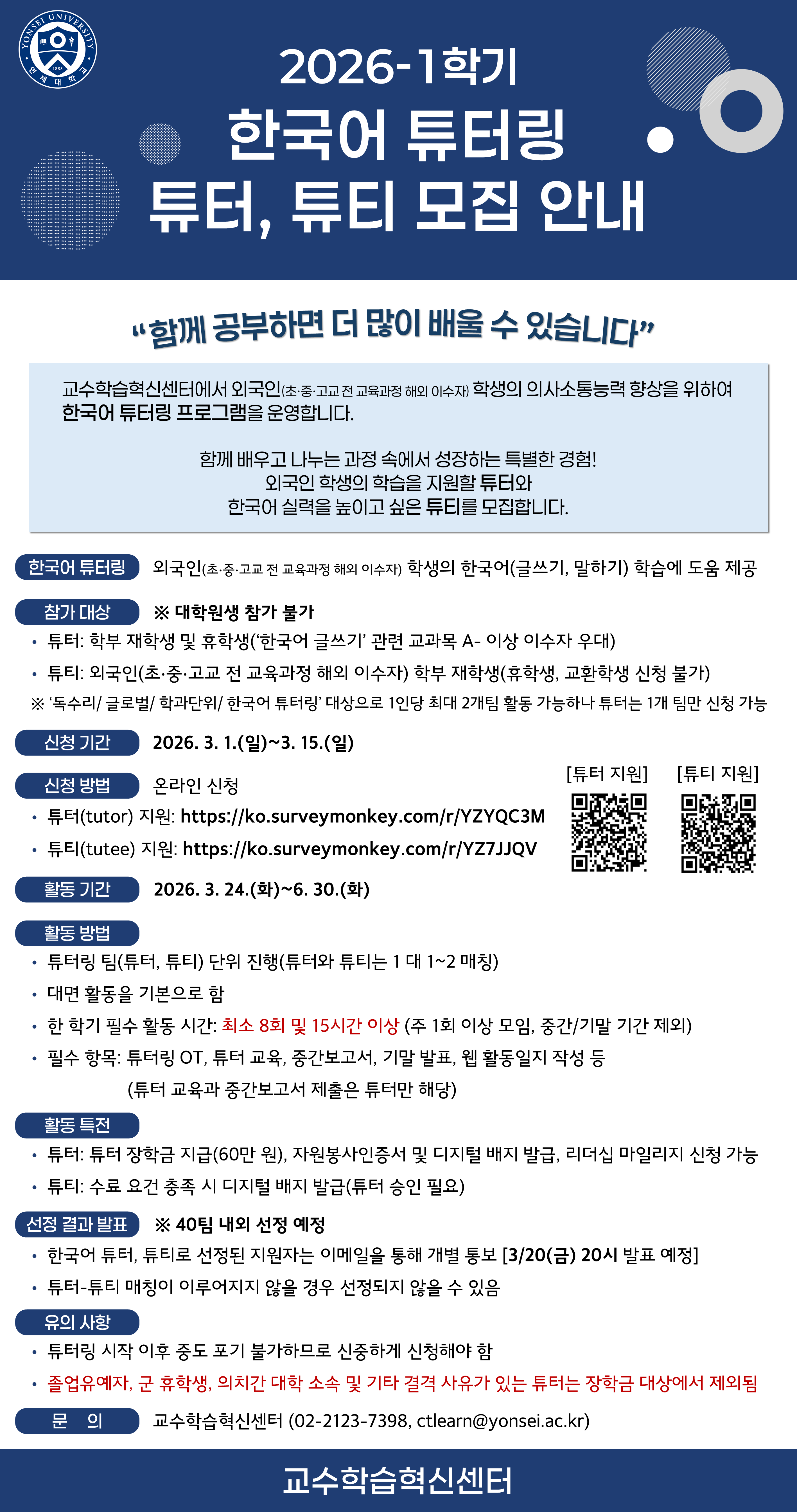 홈 yonsei-music 2026-1학기 한국어 튜터링 튜터, 튜티 모집 안내(~3/15) yonsei-music 음악대학 2026-1학기 한국어 튜터링 튜터, 튜티 모집 안내(~3/15) 작성자: 음악대학 게시일: 2026. 2. 27. 오전 12:00:00