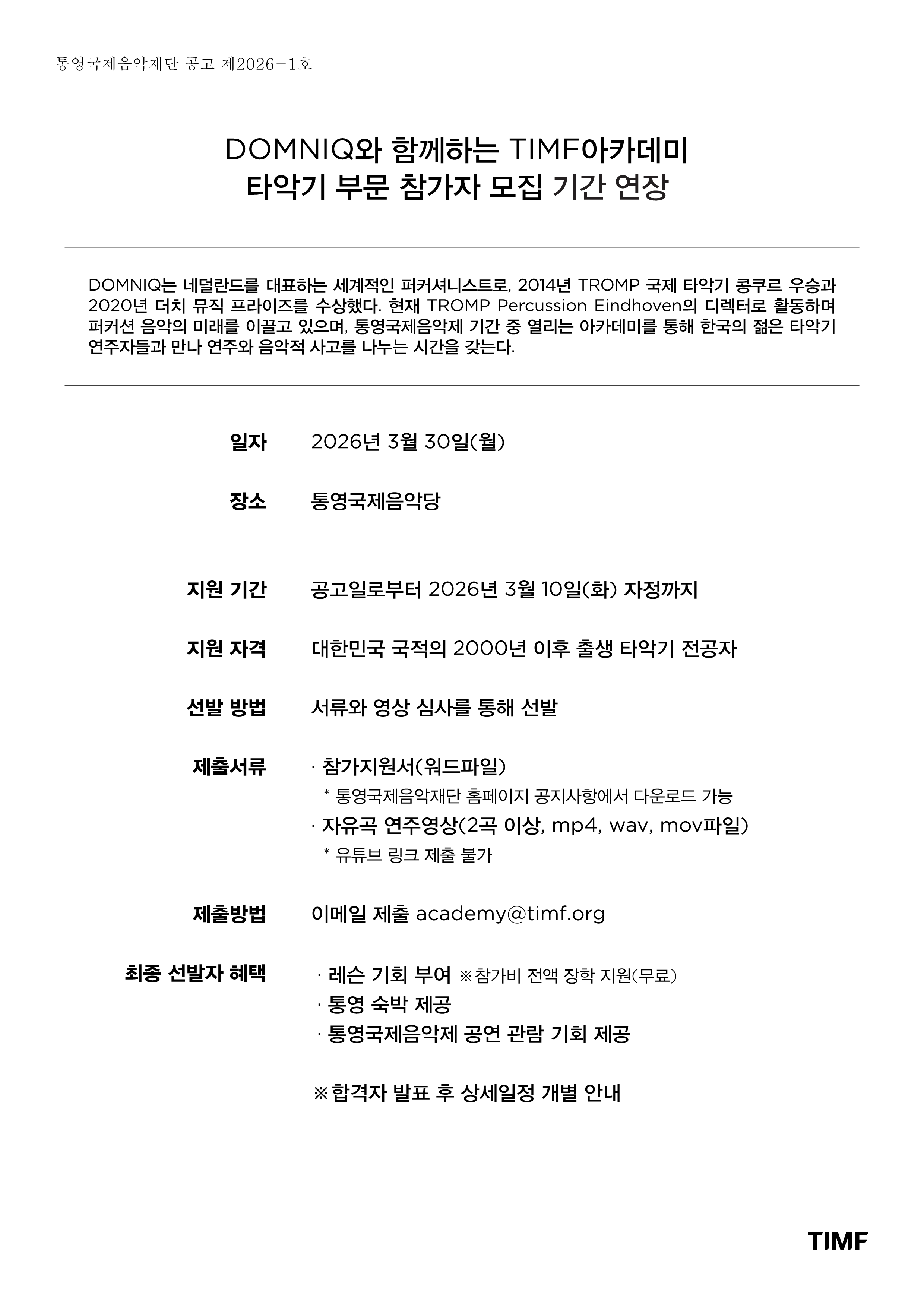 홈 yonsei-music DOMNIQ와 함께하는 TIMF아카데미 타악기 부문 참가자 모집 기간 연장(~3/10) yonsei-music 음악대학 DOMNIQ와 함께하는 TIMF아카데미 타악기 부문 참가자 모집 기간 연장(~3/10) 작성자: 음악대학 게시일: 2026. 3. 3. 오전 12:00:00 첨부파일 DOMNIQ와 함께하는 TIMF아카데미 타악기부문_참가지원서.docx
