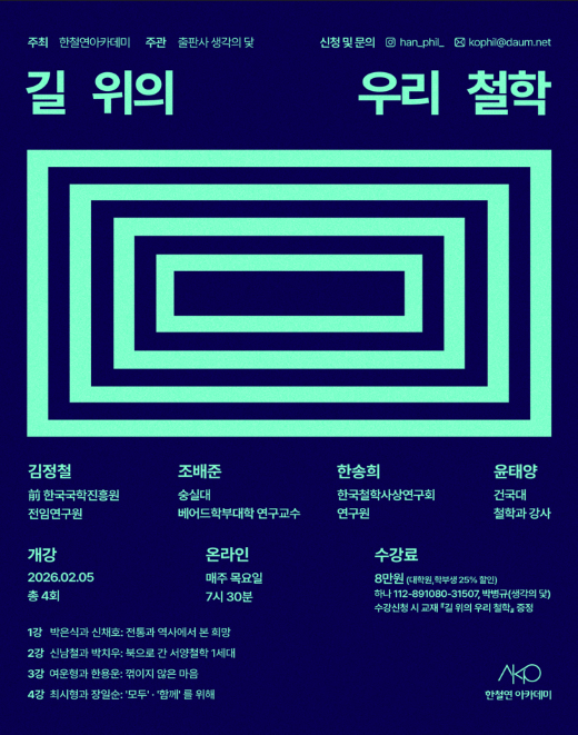 : 한국철학사상연구회 한국철학분과의 연구가 집대성되어 출간된 『길 위의 우리 철학』의 저자들이 돌아가며 1강씩 맡게 되는 저자 직강
