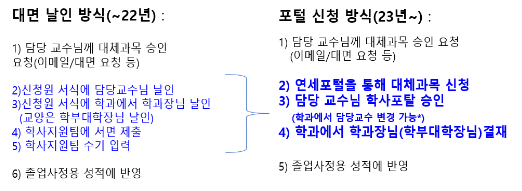 학사지원팀에 제출하던 각종 학점/교과목 대체 신청원 접수 절차가 포탈을 통해 승인 및 접수하는 방식으로 변경되었습니다.