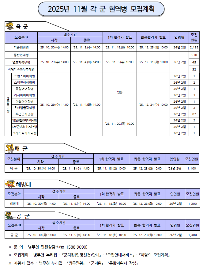 홈 yonsei 일반 2025년 11월 각 군 현역병 모집계획 (서울지방병무청)} yonsei 일반 학생지원팀 2025년 11월 각 군 현역병 모집계획 (서울지방병무청)} 작성자: 학생지원팀 게시일: 2025. 10. 28. 오후 3:02:06 첨부파일 '25년 11월 각 군 현역병 모집계획(배부용).pdf