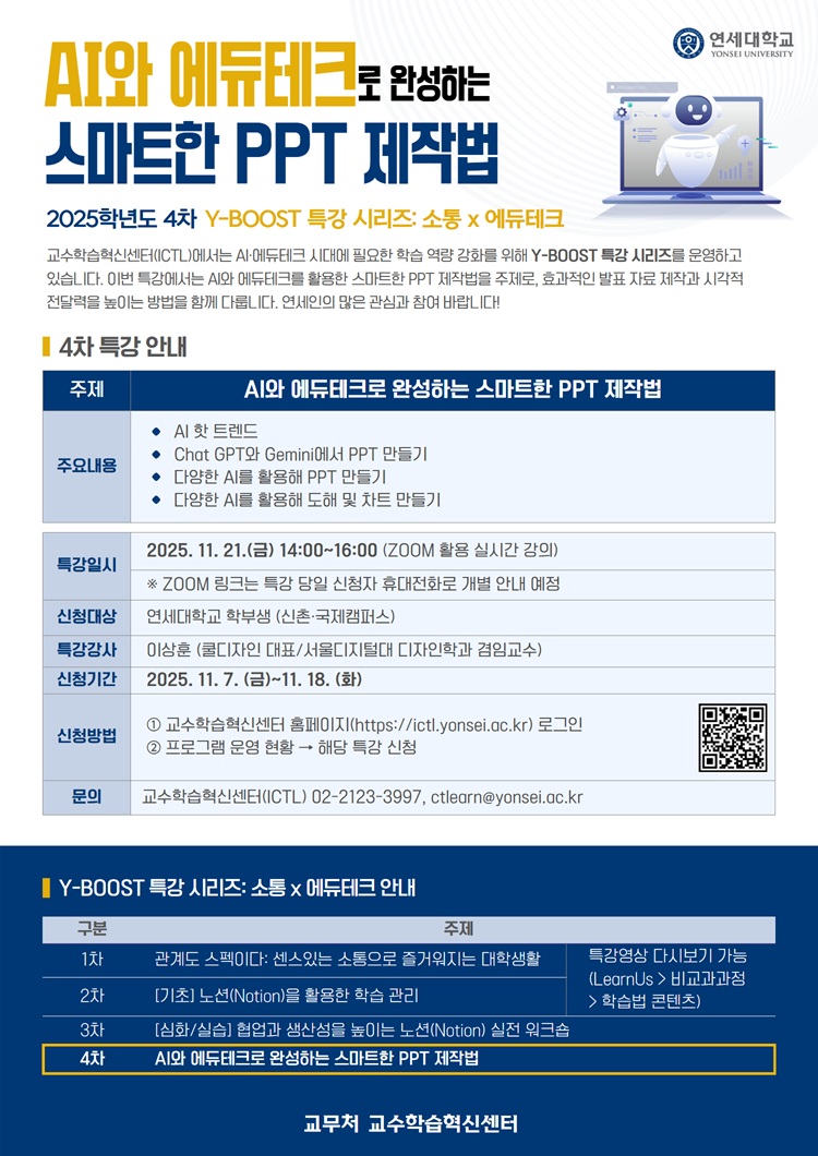 홈 yonsei 일반 [Y-BOOST 특강] AI와 에듀테크로 완성하는 스마트한 PPT 제작법} yonsei 일반 직원 [Y-BOOST 특강] AI와 에듀테크로 완성하는 스마트한 PPT 제작법} 작성자: 직원 게시일: 2025. 11. 7. 오후 2:57:33 [Y-BOOST 특강] AI와 에듀테크로 완성하는 스마트한 PPT 제작법 분류 [일반] 작성자 직원 조회수 196 작성일 2025.11.07 담당부서 교수학습혁신센터