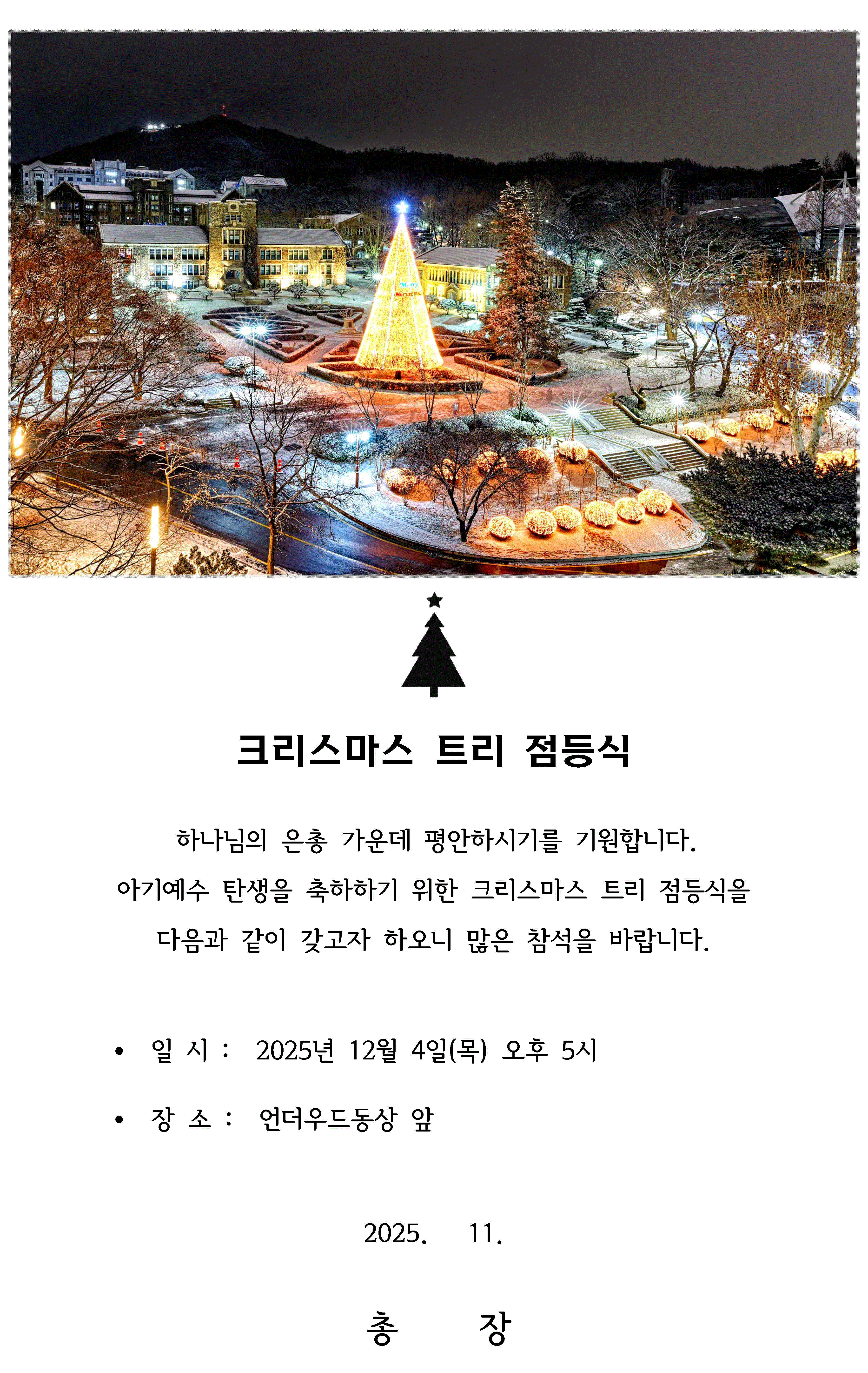 홈 yonsei 일반 크리스마스 트리 점등식 행사 안내} yonsei 일반 총무팀 크리스마스 트리 점등식 행사 안내} 작성자: 총무팀 게시일: 2025. 11. 24. 오전 9:55:47 크리스마스 트리 점등식 행사 안내 분류 [일반] 작성자 총무팀 조회수 588 작성일 2025.11.24 담당부서 총무처 총무팀