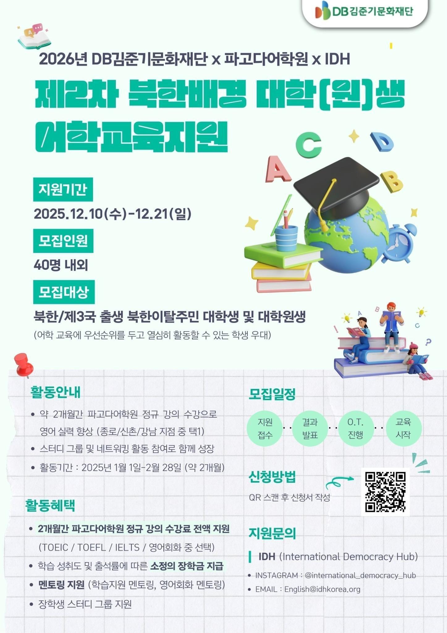 홈 yonsei 장학 북한배경 대학(원)생 대상 어학교육지원 장학생 모집 안내} yonsei 장학 학생지원팀(장학) 북한배경 대학(원)생 대상 어학교육지원 장학생 모집 안내} 작성자: 학생지원팀(장학) 게시일: 2025. 12. 12. 오전 9:03:44